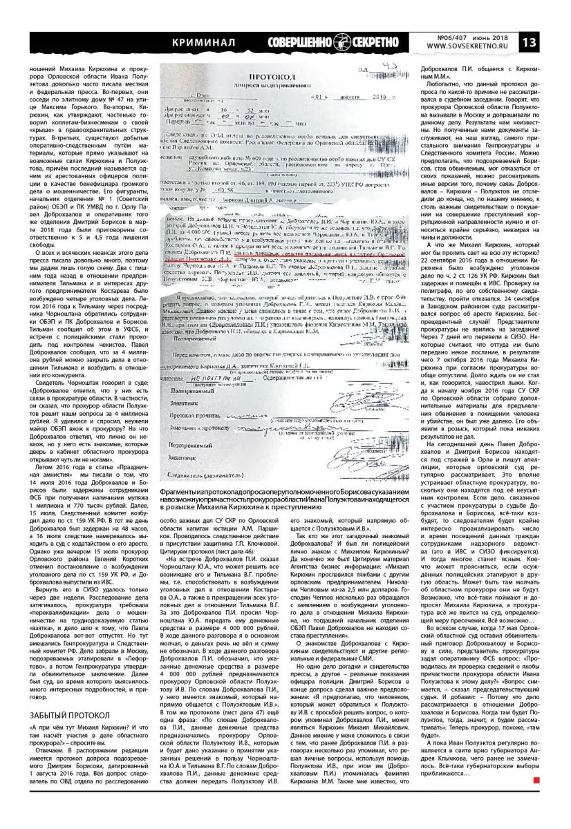 Любопытно, что данный протокол допроса по какой-то причине не рассматривался в судебном заседании. Говорят, что прокурора Орловской области Полуэктова вызывали в Москву и допрашивали по данному делу. Результаты нам неизвестны. Но полученные нами документы заслуживают, на наш взгляд, самого пристального внимания Генпрокуратуры и Следственного комитета России. Можно предполагать, что подозреваемый Борисов, став обвиняемым, мог отказаться от своих показаний, можно рассматривать иные версии того, почему связь Доброхвалов – Кирюхин – Полуэктов не отследили до конца, но, по нашему мнению, к столь важным свидетельствам о покушении на совершение преступлений коррупционной направленности нужно и относиться крайне серьёзно, невзирая на чины и должности.