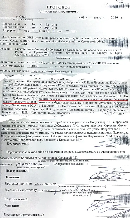 Фрагменты из протокола допроса оперуполномоченного Борисова с указанием на возможную причастность прокурора области Ивана Полуэктова и находящегося в розыске Михаила Кирюхина к преступлению