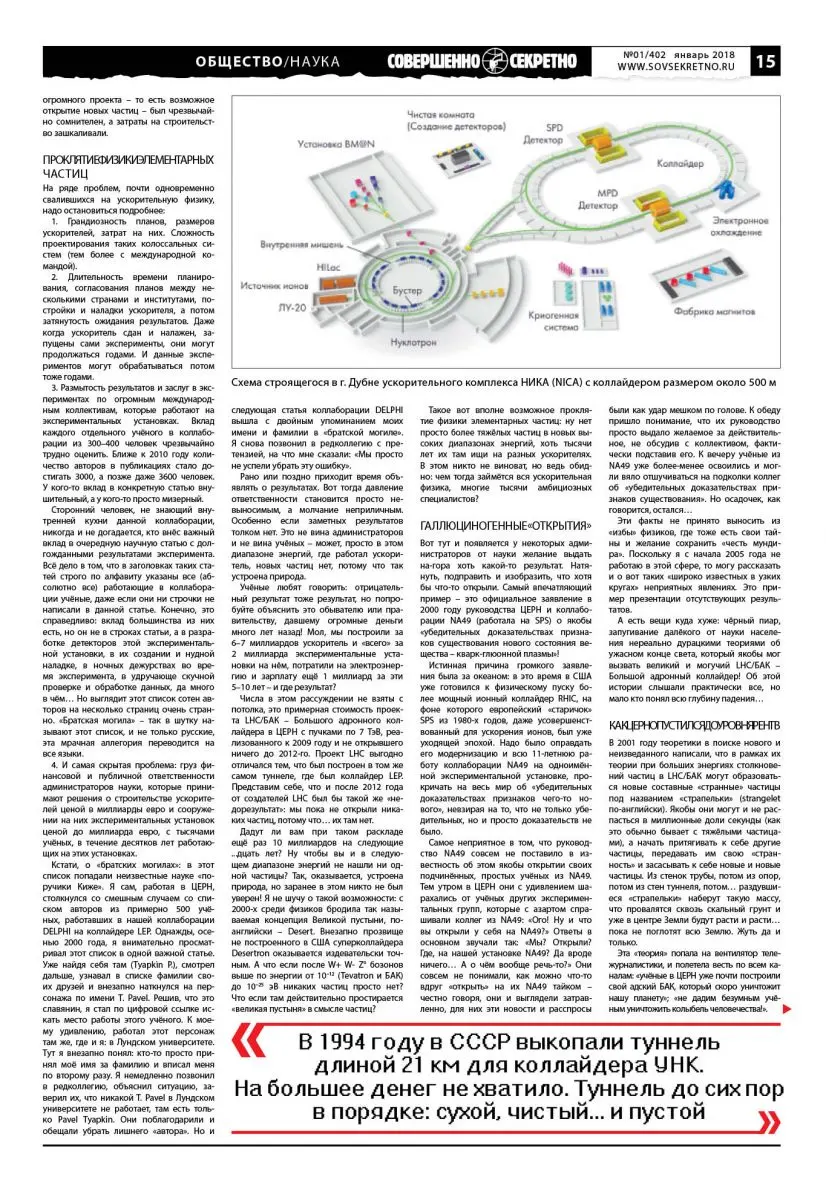 В СССР в том же 1983 году замахнулись на меньший конкурирующий проект под названием УНК (Ускорительно-накопительный комплекс) для Института физики высоких энергий (ИФВЭ). Этот протонный коллайдер с энергией пучка до 3 ТэВ должен был располагаться в туннеле длиной 21 км (на глубинах от 20 до 60 метров) около города Протвино под Москвой. Туннель к 1994 году успели выкопать целиком. На большее денег не хватило, проект закрыли, а туннель до сих пор в порядке: сухой, чистый… и пустой. Для чего его применить, никто до сих пор так и не придумал. Хорошо, что в СССР не успели наделать дорогих магнитов к замороженному проекту, как в США.