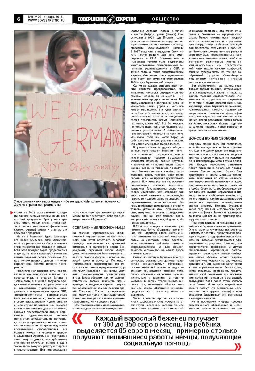 «Политическая корректность» как понятие и как идеология успешно распространилась в странах Запада в 1990-е годы, а в 2000-е получила официальное признание в правительствах и официальных учреждениях. Зародившись в академических кругах США, «политкорректность» первоначально была направлена на то, чтобы человек в своих высказываниях и действиях ни в коем случае не задевал или ущемлял право и достоинство другого человека, включая представителей любых меньшинств. Здравомыслящий человек мог с этим соглашаться. Но потихоньку «политкорректность» начала становиться средством контроля над всеми проявлениями свободомыслия, все больше походя на «полицию нравов» в Саудовской Аравии. Все несогласные легко могут подвергнуться публичному линчеванию вплоть до вызова в суд, а также легко потерять работу и средства к существованию. Для подтверждения этого существует достаточно примеров. Могли ли вы представить себе это в демократической Германии?