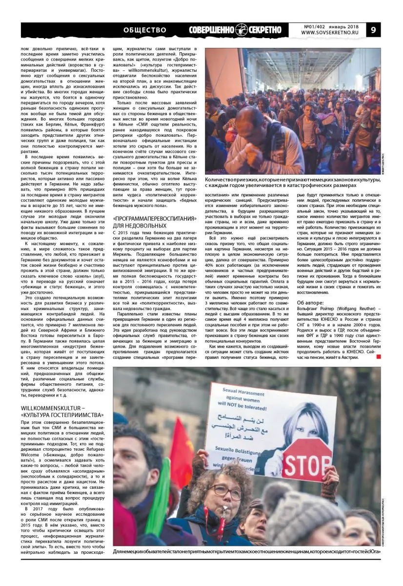 Только после массовых заявлений женщин о сексуальных домогательствах со стороны беженцев в общественных местах во время новогодней ночи в Кёльне «СМИ ощутили реальность, ранее находившуюся под покровом риторики «добро пожаловать». Первоначально официальные инстанции хотели это скрыть от населения. Но в конечном счёте случаи массового сексуального домогательства в Кёльне стали поворотным пунктом для прессы и полиции – они хотя бы больше не занимаются очковтирательством. Интересно при этом, что на волне Кёльна феминистки, обычно оголтело выступающие за права женщин, тут проявили чудеса «политической корректности» и начали защищать «бедных беженцев мужского пола»