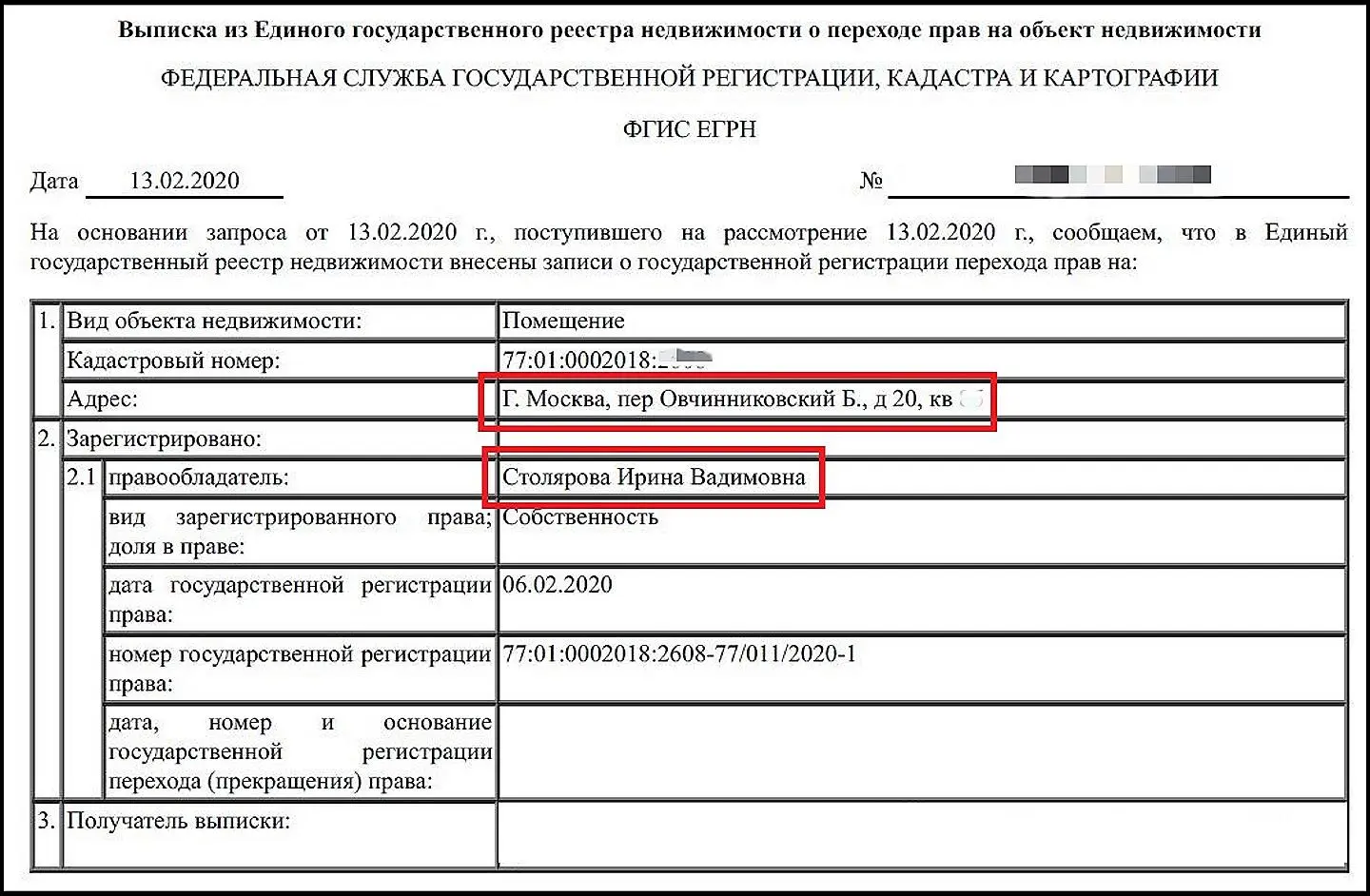 Открытые данные Единого государственного реестра недвижимости указывают на то, что Столярова - собственник элитной недвижимости на Большом Овчинниковском пер., д. 20 в Москве. В феврале квартиру разделили на две части, однако Ирина осталась собственником в обоих случаях.
