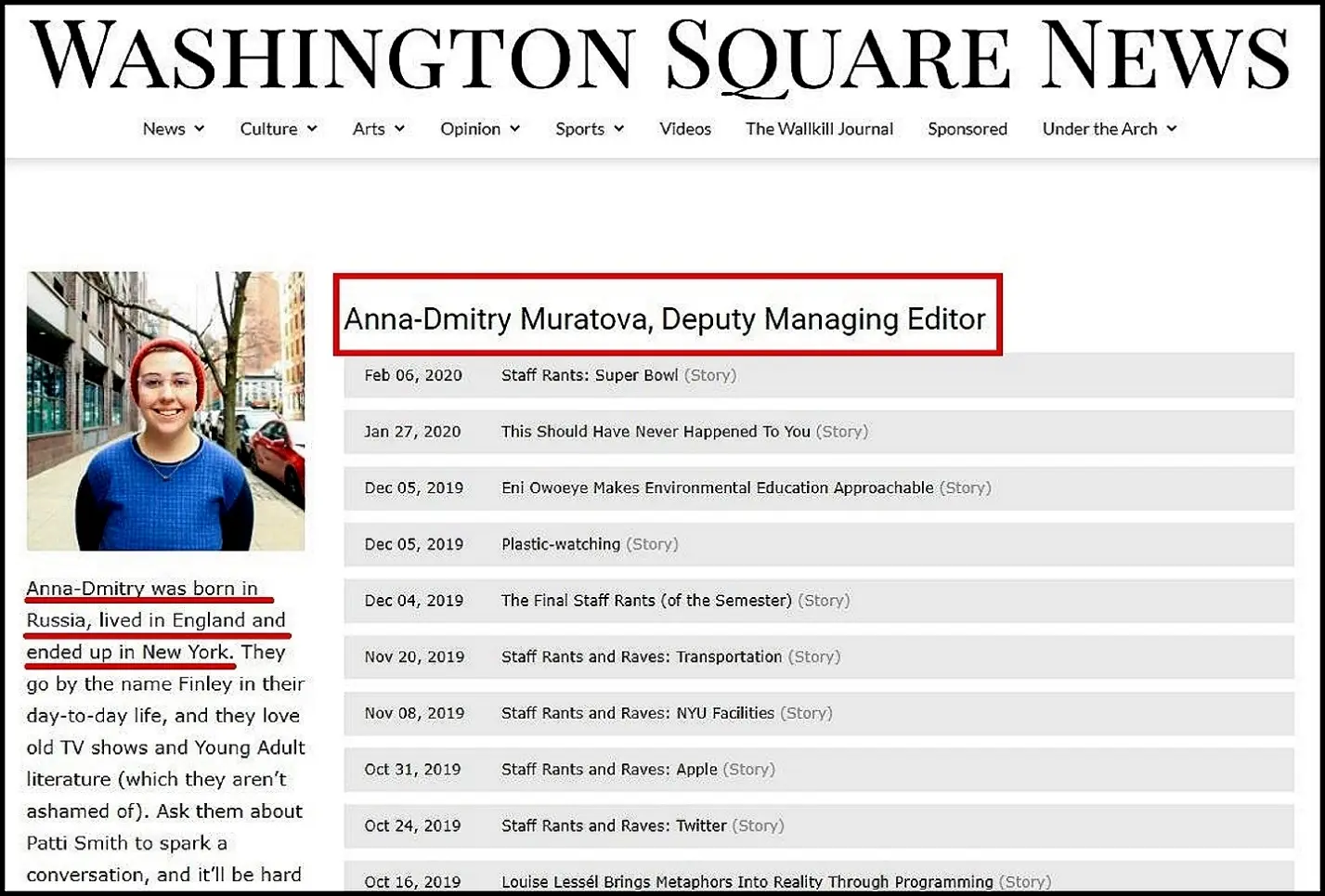 Младшая дочь Муратова Анна сейчас учится в нью-йоркском CAS на кафедре журналистики. Среднее образование дочь главреда «Новой» получала в Оксфорде. Не имея серьезных навыков, Анна Муратова «случайным» образом заняла место главного репортера и заместителя главного редактора Washington Square News.