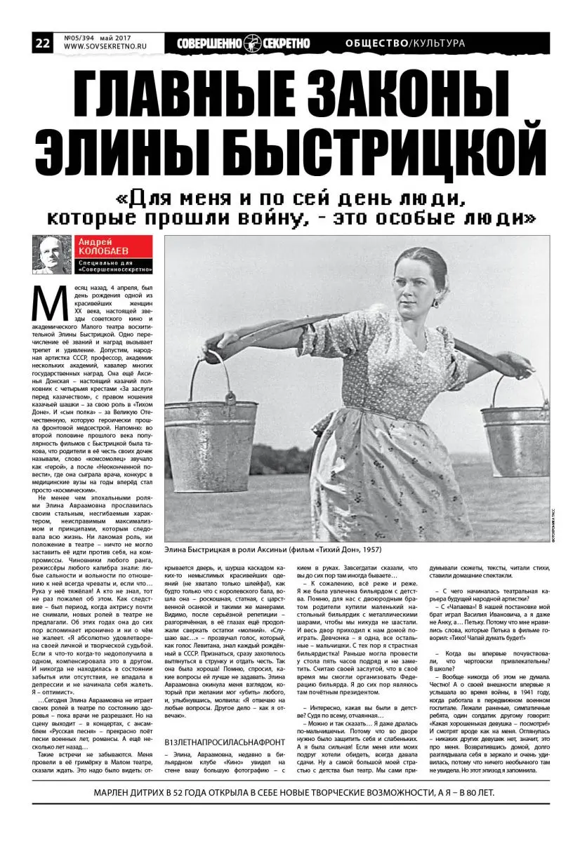 Месяц назад, 4 апреля, был день рождения одной из красивейших женщин XX века, настоящей звезды советского кино и академического Малого театра восхитительной Элины Быстрицкой. Одно перечисление её званий и наград вызывает трепет и удивление. Допустим, народная артистка СССР, профессор, академик нескольких академий, кавалер многих государственных наград. Она ещё Аксинья Донская – настоящий казачий полковник с четырьмя крестами «За заслуги перед казачеством», с правом ношения казачьей шашки – за свою роль в «Тихом Доне». И «сын полка» – за Великую Отечественную, которую героически прошла фронтовой медсестрой. Напомню: во второй половине прошлого века популярность фильмов с Быстрицкой была такова, что родители в её честь своих дочек называли, слово «комсомолец» звучало как «герой», а после «Неоконченной повести», где она сыграла врача, конкурс в медицинские вузы на годы вперёд стал просто «космическим».