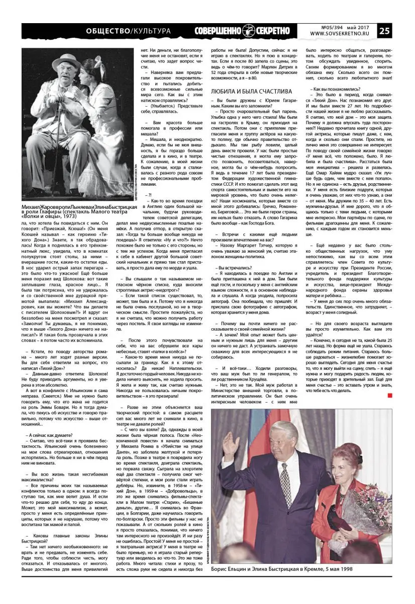 разгорячённая, в её глазах ещё продолжали сверкать остатки «молний». «Слушаю вас…» – прозвучал голос, который, как голос Левитана, знал каждый рождённый в СССР. Признаться, сразу захотелось вытянуться в струнку и отдать честь. Так она была хороша! Помню, спросил, какие вопросы ей лучше не задавать. Элина Авраамовна окинула меня взглядом, который при желании мог «убить» любого, и, улыбнувшись, молвила: «Я отвечаю на любые вопросы. Другое дело – как я отвечаю».