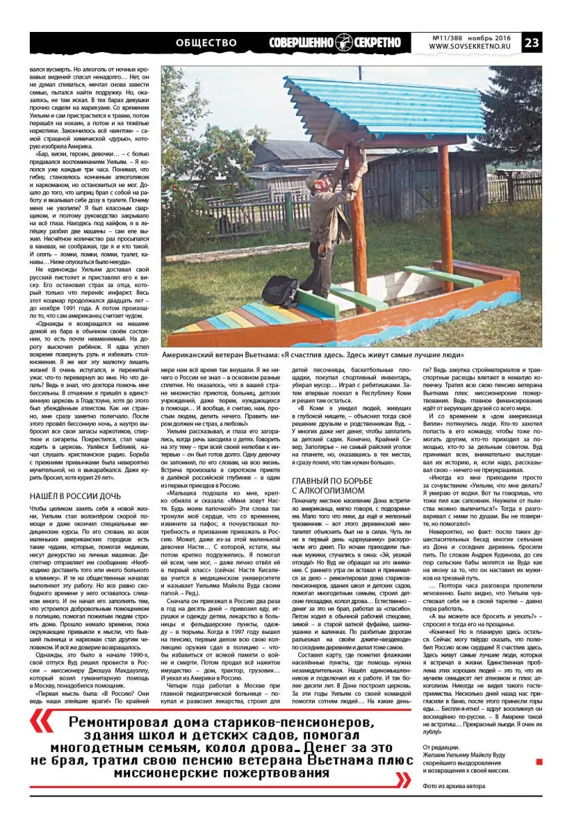 «Малышка подошла ко мне, крепко обняла и сказала: «Меня зовут Настя. Будь моим папочкой!» Эти слова так тронули моё сердце, что со временем, извините за пафос, я почувствовал потребность и призвание приезжать в Россию. Может, даже из-за этой маленькой девочки Насти… С которой, кстати, мы потом крепко подружились. Я помогал ей всем, чем мог, – даже лично отвёл её в первый класс» (сейчас Настя Киселева учится в медицинском университете и называет Уильяма Майкла Вуда своим папой. – Ред.).