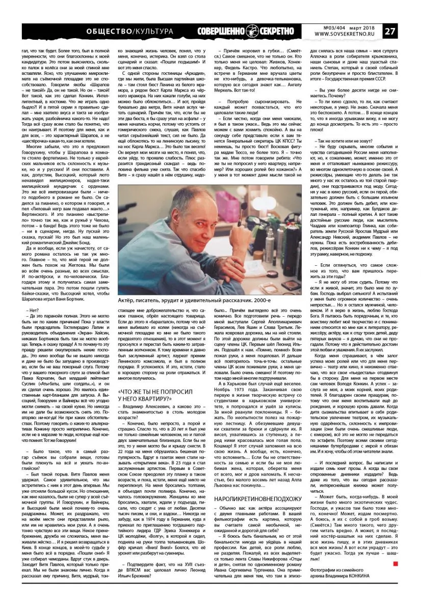 Так уж вышло, что Владимир Конкин намертво сросся с двумя картинами, которые его прославили. Именно тот случай, когда сначала при виде его шептались: «О! Павка Корчагин пошёл…», а ещё через шесть лет и до сих пор: «Смотрите, смотрите… Шарапов!» Для миллионов зрителей и спустя без малого полвека он так и остался Корчагиным–Шараповым. Лицом и кумиром поколения, объектом любви и поклонения. Актёром, киногероям которого при жизни аж три (!) памятника поставили… Однако мало кто знает, что на самом деле в фильмографии Владимира Конкина могло быть на десятки картин больше, а результат (почему бы и нет?!) куда шедевральнее. Был период, когда из него, любимого актёра партийной и комсомольской номенклатуры и, как говорили, чуть ли не любимчика Леонида Ильича Брежнева, всеми силами старались сделать «идеологическую икону», призванную своими ролями увлечь романтическую молодёжь и мобилизовать её на таёжные комсомольские стройки, на освоение целинных и прочих земель, куда Макар телят не гонял.