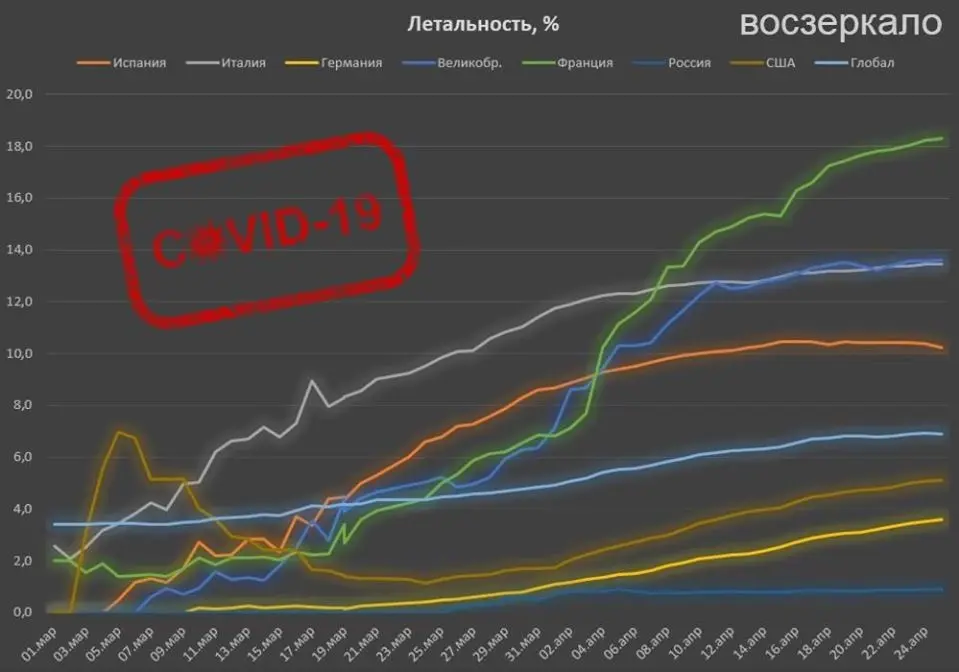 Итак, какое-то время назад я обратил внимание на следующий факт. Из тех, кто заболел в России новым вирусом, умирает менее одного процента. Это самый низкий, показатель среди стран антилидеров. Возможно, медицина в Испании или Италии ненамного лучше, чем в России, но уж в Германии-то все должно быть получше в плане качества лечения, квалификации врачей, наличия оборудования, но и там в несколько раз больше доля смертей, чем в родной стране.