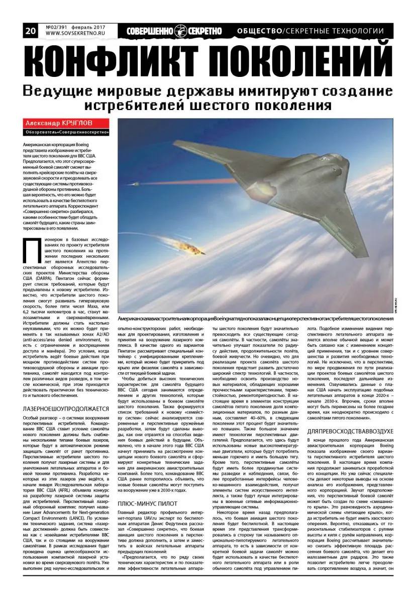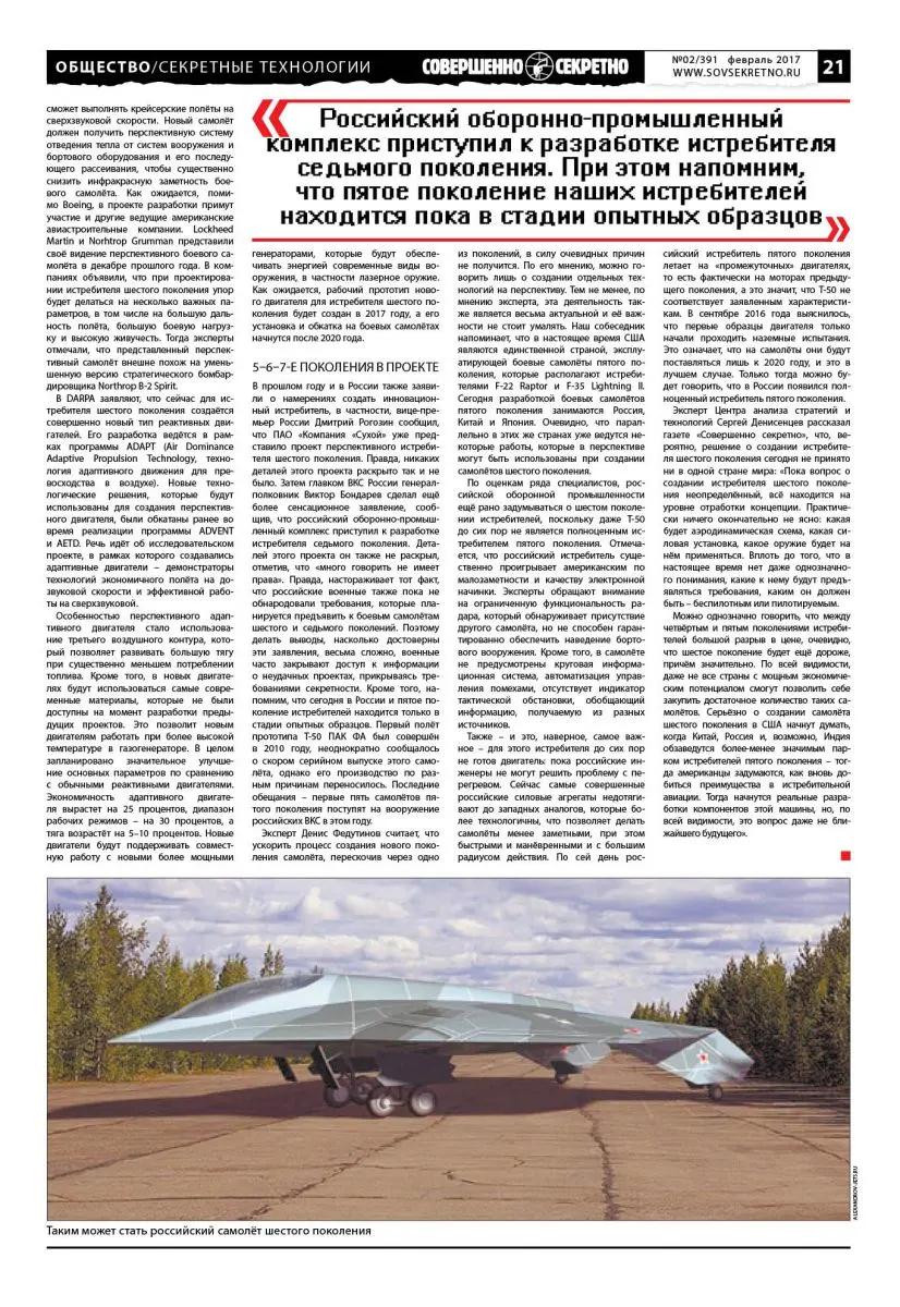 В прошлом году и в России также заявили о намерениях создать инновационный истребитель, в частности, вице-премьер России Дмитрий Рогозин сообщил, что ПАО «Компания «Сухой» уже представило проект перспективного истребителя шестого поколения. Правда, никаких деталей этого проекта раскрыто так и не было. Затем главком ВКС России генерал-полковник Виктор Бондарев сделал ещё более сенсационное заявление, сообщив, что российский оборонно-промышленный комплекс приступил к разработке истребителя седьмого поколения. Деталей этого проекта он также не раскрыл, отметив, что «много говорить не имеет права». Правда, настораживает тот факт, что российские военные также пока не обнародовали требования, которые планируется предъявить к боевым самолётам шестого и седьмого поколений. Поэтому делать выводы, насколько достоверны эти заявления, весьма сложно, военные часто закрывают доступ к информации о неудачных проектах, прикрываясь требованиями секретности. Кроме того, напомним, что сегодня в России и пятое поколение истребителей находится только в стадии опытных образцов. Первый полёт прототипа Т-50 ПАК ФА был совершён в 2010 году, неоднократно сообщалось о скором серийном выпуске этого самолёта, однако его производство по разным причинам переносилось. Последние обещания – первые пять самолётов пятого поколения поступят на вооружение российских ВКС в этом году.