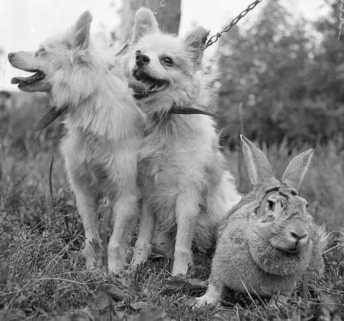 Собаки Отважная, Малёк и кролик Звёздочка после возвращения из космоса