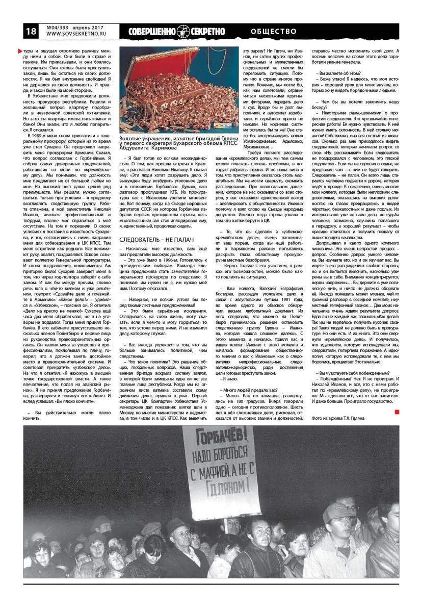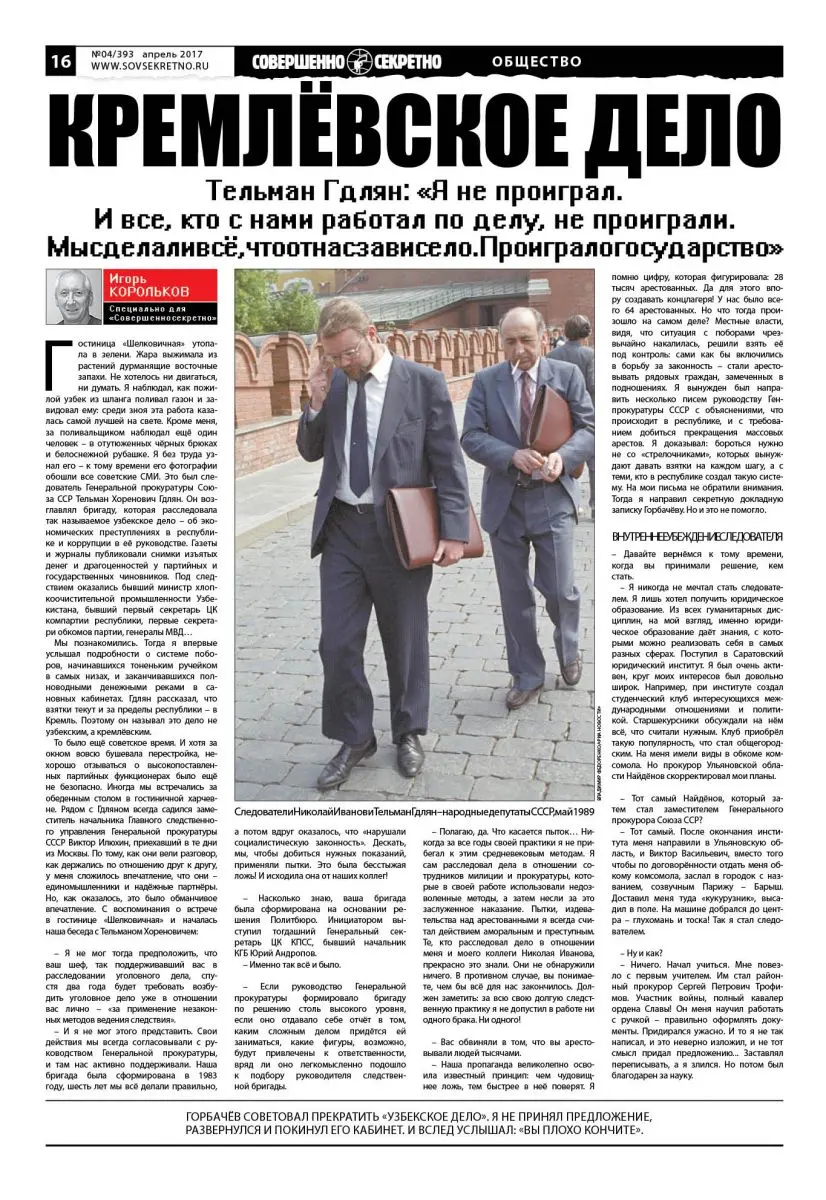 В 1989-м меня снова пригласили к генеральному прокурору, которым на то время уже стал Сухарев. Он предложил направить меня прокурором Армении. Сказал, что вопрос согласован с Горбачёвым. Я собрал самых доверенных следователей, работавших со мной по «кремлёвскому делу». Мы понимали, что должность мне предлагают не от большой любви ко мне. Но высокий пост давал целый ряд преимуществ. Мы решили: нужно соглашаться. Только при условии – я продолжу возглавлять следственную группу. Работа отлажена, и мой заместитель Николай Иванов, человек профессиональный и твёрдый, вполне мог справиться в моё отсутствие. На том и порешили. О своих условиях я поставил в известность Сухарева, и тот, согласившись с ними, направил меня для собеседования в ЦК КПСС. Там меня встретили как родного. Все пожимают руку, хвалят, поздравляют. Вскоре созывают коллегию Генеральной прокуратуры. И снова поздравления, комплименты. Аж приторно было! Сухарев заверяет меня в том, что через год-полтора заберёт к себе замом. И как бы между прочим, словно речь шла о чём-то мелком и уже решённом, говорит: «Сдавайте дело и поезжайте в Армению». «Какое дело?» – удивился я. «Узбекское», – пояснил он. Я ответил: «Дело на кресло не меняю!» Сухарев ещё часа два меня обрабатывал, но я на уговоры не поддался. Тогда меня принял Горбачёв. В его кабинете присутствовало несколько членов Политбюро и первые лица из руководства правоохранительных органов. Он хвалил меня за упорство и профессионализм, похлопывал по плечу, говорил, что я должен занять достойное место в правоохранительной системе. И советовал прекратить «узбекское дело». На что я ответил: «Я нахожусь в высшей точке государственной власти. А такое впечатление, что попал на алайский рынок». Я не принял предложение Горбачёва, развернулся и покинул его кабинет. И вслед услышал: «Вы плохо кончите».