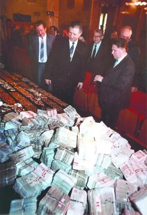 Генеральный прокурор СССР Александр Рекунков (в центре) и заместитель генпрокурора Александр Сухарев (справа) рассматривают изъятые деньги и ценности