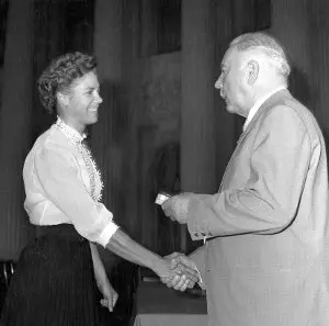 К. Ворошилов награждает Ларису орденом Ленина за победы на Олимпиаде в Мельбурне. 1957. Тогда Лариса выиграла четыре золотые медали: в командном, абсолютном первенствах, вольных упражнениях, опорном прыжке. И ещё серебряную – за брусья