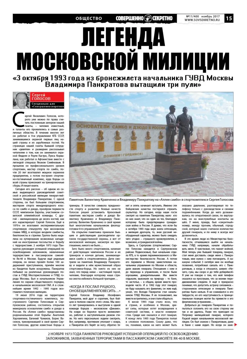 Сегодня его рассказ – об одном из самых выдающихся руководителей советской и российской милиции генерал-лейтенанте Владимире Панкратове. С одной стороны, он был большим спортсменом, мастером спорта международного класса по самбо и дзюдо, призёром первенств СССР, чемпионом Европы, участником советской олимпийской команды. С другой – милиционером до мозга костей, как его характеризует Сергей Голосов. Ещё в 1970-х он возглавил экспериментальную спортивную спецгруппу при московском главке МВД, в которую входили самбисты, биатлонисты и стрелки. Группа была нацелена на купирование возможных нападений на иностранные посольства и борьбу с террористами. 2 ноября 1973 года Панкратов руководил успешной операцией по освобождению заложников, захваченных террористами в пассажирском самолёте Як-40 в Москве. Будучи ещё рядовым опером, он лично провёл более 100 задержаний преступников, причём многие из бандитов были вооружены. Панкратов побывал на различных руководящих постах в ГУВД Мосгорисполкома и ГУВД города Москвы. Был и начальником Управления по охране общественного порядка, и начальником московской ГАИ. А в сложнейшее время 1992 – 1995 годов возглавлял столичную милицию.