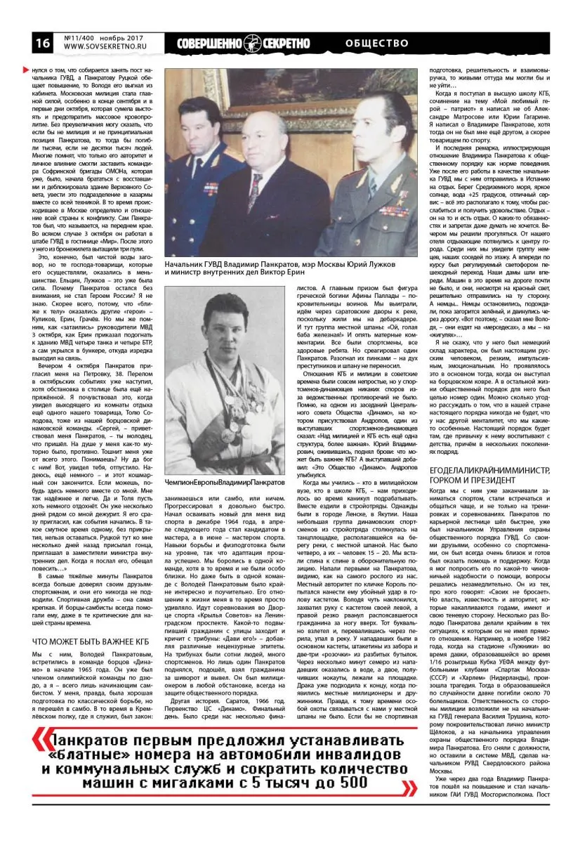 Когда мы с ним уже заканчивали заниматься спортом, стали встречаться и общаться чаще, и не только на тренировках и соревнованиях. Панкратов по карьерной лестнице шёл быстрее, уже был начальником Управления охраны общественного порядка ГУВД. Со своими друзьями, особенно со спортсменами, он был всегда очень близок и готов был оказать помощь и поддержку. Когда я мог попросить его по какой-то чиновничьей надобности о помощи, вопросы решались незамедлительно. Он из тех, про кого говорят: «Своих не бросает». Но власть, известность и авторитет, которые накапливаются годами, имеют и свою теневую сторону. Несколько раз Володю Панкратова делали крайним в тех ситуациях, к которым он не имел прямого отношения. Например, в ноябре 1982 года, когда на стадионе «Лужники» во время давки, образовавшейся во время 1/16 розыгрыша Кубка УЕФА между футбольными клубами «Спартак Москва» (СССР) и «Харлем» (Нидерланды), произошла трагедия. Тогда в образовавшейся по случайности давке погибли около 70 болельщиков. Ответственность со стороны милиции возложили не на начальника ГУВД генерала Василия Трушина, которому покровительствовал лично министр Щёлоков, а на начальника управления охраны общественного порядка Владимира Панкратова. Его сняли с должности, но оставили в системе МВД, сделав начальником РУВД Свердловского района Москвы.