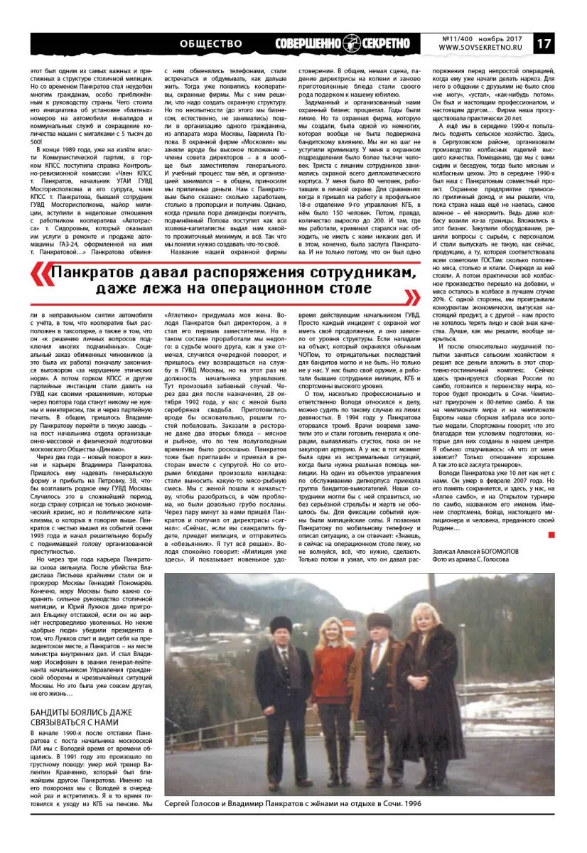 Здесь, в Серпухове (спорткомплекс Сергея Голосова находится в Серпуховском районе Подмосковья), был начальник отдела КГБ, в то время переименованного в Министерство безопасности России. А потом его перевели в Москву заместителем начальника управления по Москве и области, дали звание генерала. Отношения с ним и до перехода в управление, и после были хорошими, доверительными. Мы вместе отдыхали, выезжали на природу – то баня, то застолье, – в общем, время вместе проводили часто. И в 1992 году этот генерал, не буду называть его фамилию, он жив ещё, узнал, что Володя Панкратов стал начальником ГУВД Москвы. Я их познакомил, мы вместе встретились, и они стали общаться