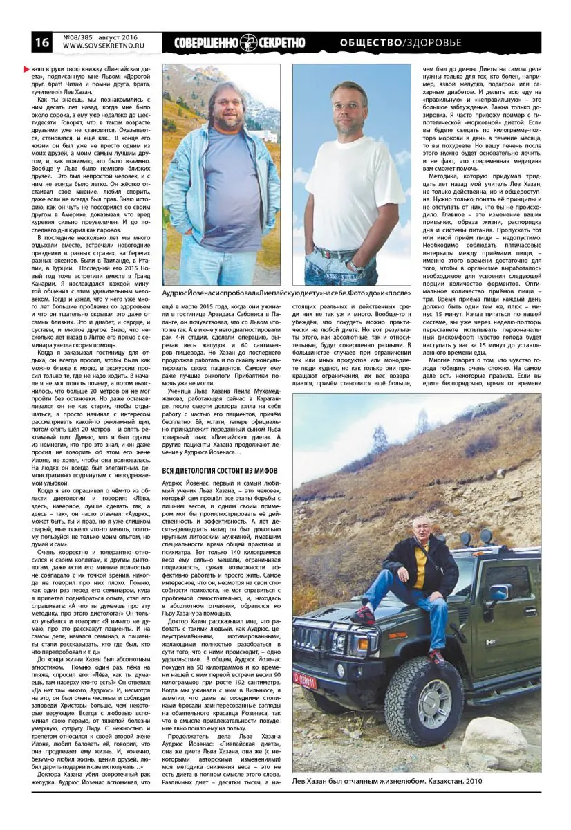 А ещё у Льва Хазана был свой доктор Ватсон, кстати, совершенно непохожий на литературного соратника Холмса. Любимый ученик и лучший друг Льва Хазана Аудрюс Йозенас – это умнейший и обаятельнейший человек, который сумел дать новый импульс открытому Львом Хазаном методу борьбы с лишним весом и стать его настоящим наследником. Сегодня Аудрюса Йозенаса, гражданина Литвы, считают самым «продвинутым» диетологом Казахстана, а лечатся у него, как и у Хазана, люди из десятков стран мира.