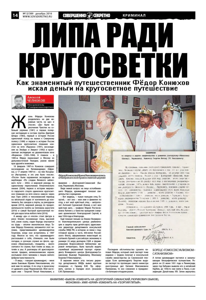 А между «до» и «после» стоит фигура в рясе: близко посаженные глаза, высокий лоб, узкие скулы, седая борода опускается на грудь – вполне иконописное лицо. Таким Фёдору Конюхову запомнится этот человек, представившийся архимандритом Георгием, когда они встретились в 1997 году. Многое из того, что «архимандрит» рассказывал о себе, сближало: они были погодки, и срочную служил во флоте, «духовно образованный», страдалец – много скитался по стране, был гоним за веру, заточён в узы. А разговоры об аристократических предках, великокняжеских корнях окутывали этого человека с лицом святого флёром таинственности.