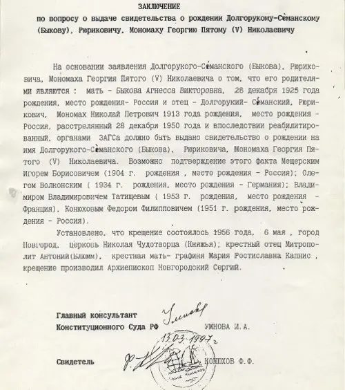 Приведём это заключение от первой до последней строчки: «На основании заявления Долгорукого-Симанского (Быкова), Рюриковича, Мономаха Георгия Пятого (V) Николаевича о том, что его родителями являются: мать – Быкова Агнесса Викторовна, 28 декабря 1925 года рождения, место рождения – Россия, и отец – Долгорукий-Симанский, Рюрикович, Мономах Николай Петрович, 1913 года рождения, место рождения – Россия, расстрелянный 28 декабря 1950 года и впоследствии реабилитированный, органами ЗАГСа должно быть выдано свидетельство о рождении на имя Долгорукого-Симанского (Быкова), Рюриковича, Мономаха Георгия Пятого (V) Николаевича. Возможно подтверждение этого факта Мещерским Игорем Борисовичем (1904 г. рождения, место рождения – Россия); Олегом Волконским (1934 г. рождения, место рождения – Германия); Владимиром Владимировичем Татищевым (1953 г. рождения, место рождения – Франция); Конюховым Фёдором Филипповичем (1951 г. рождения, место рождения – Россия).