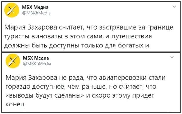 Навальный рассказал слушателям о том, что подобные высказывания Захаровой можно было услышать в интервью бывшему главреду «Дождя» Михаилу Зыгарю. Однако все описанное выше оказалось вбросом, о чем публично заявила Захарова ещё 29 апреля. Представительница МИД действительно общалась с Зыгарем, однако темой разговора было несерьезное отношение россиян к планированию заграничных отпусков. Подобное мнение Захаровой поддержал даже Рустем Адагамов - известный оппозиционный деятель.