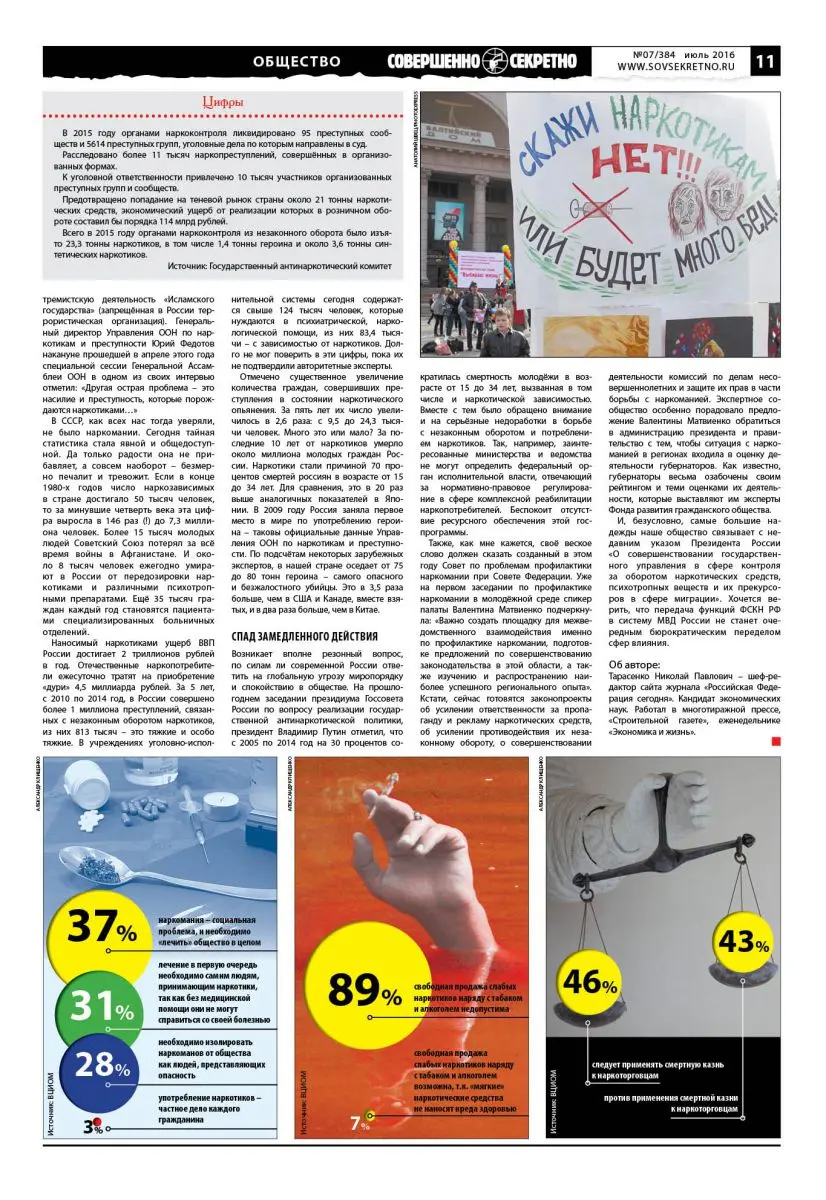 Отмечено существенное увеличение количества граждан, совершивших преступления в состоянии наркотического опьянения. За пять лет их число увеличилось в 2,6 раза: с 9,5 до 24,3 тысячи человек. Много это или мало? За последние 10 лет от наркотиков умерло около миллиона молодых граждан России. Наркотики стали причиной 70 процентов смертей россиян в возрасте от 15 до 34 лет. Для сравнения, это в 20 раз выше аналогичных показателей в Японии. В 2009 году Россия заняла первое место в мире по употреблению героина – таковы официальные данные Управления ООН по наркотикам и преступности. По подсчётам некоторых зарубежных экспертов, в нашей стране оседает от 75 до 80 тонн героина – самого опасного и безжалостного убийцы. Это в 3,5 раза больше, чем в США и Канаде, вместе взятых, и в два раза больше, чем в Китае.
