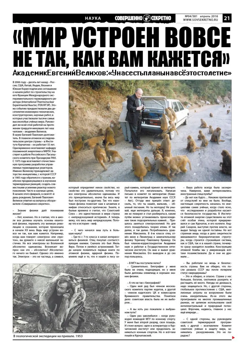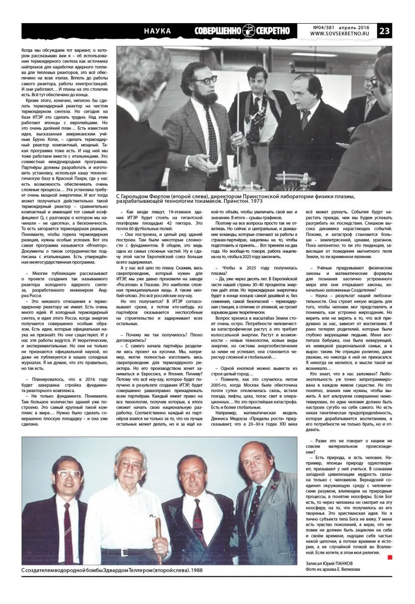 В 2006 году – десять лет назад – Россия, США, Китай, Индия, Япония и Южная Корея подписали соглашение о начале работ по строительству на юге Франции Международного экспериментального термоядерного реактора (International Thermonuclear Experimental Reactor, ITER/ИТЭР). Этому событию предшествовали два десятилетия инженерно-технических, конструкторских, научных работ, в которых участвовали тысячи самых высоколобых учёных мира. Руководил же всей этой работой на протяжении тридцати минувших лет наш человек – академик Велихов. В науке Евгений Павлович долгожитель. В главном атомном исследовательском центре страны – в Институте Курчатова – он работает 55 лет. Одновременно возглавляет кафедру плазменной энергетики в МФТИ. Участвует в работе Российского Пагуошского комитета при Президиуме РАН. С 1975 года возглавляет отечественную программу разработки управляемых термоядерных реакторов. Именно Велихову принадлежит авторство инициативы, с которой СССР в 1985 году обратился к странам, наиболее продвинувшимся в изучении термоядерных реакций, создать совместными усилиями реактор нового поколения. Чисто в научных целях. В начале этого февраля, в свой 81-й день рождения, Евгений Павлович Велихов ответил на вопросы обозревателя «Совершенно секретно».