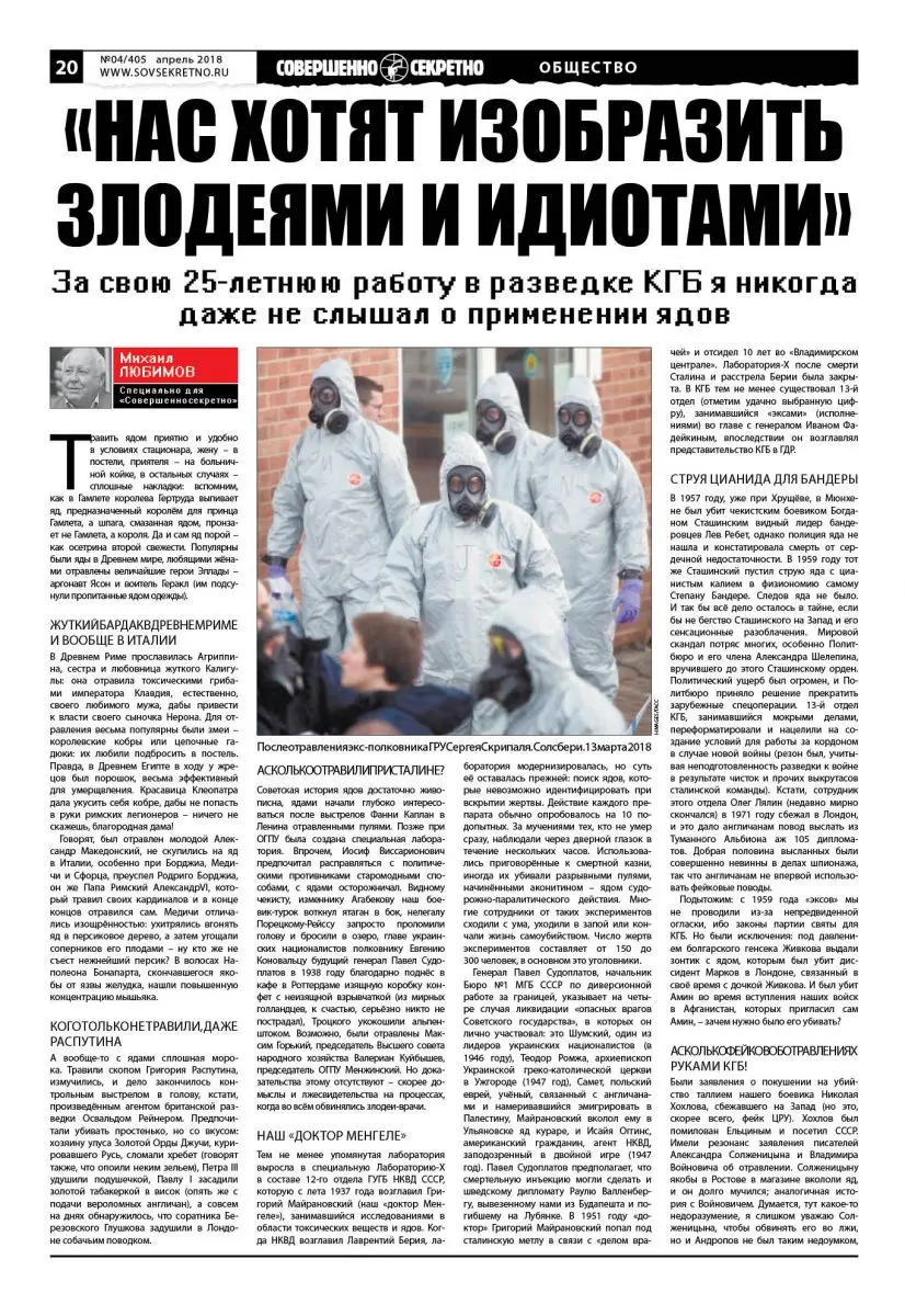 За свою 25-летнюю работу в разведке КГБ я никогда даже не слышал о применении ядов. Беглый кагэбэшник, английский шпион, ныне кавалер ордена Святого Михаила и Святого Георгия Олег Гордиевский в своей книге пишет, что руководство службы, подозревая его в измене, допрашивало его, якобы подмешав в коньяк некое расслабляющее вещество, однако он не раскололся, а потом с помощью англичан убежал в Финляндию и далее на вторую туманную родину. Но расслабляющее вещество – не яд, я сам расслабляюсь лекарством (или разбавленным виски).
