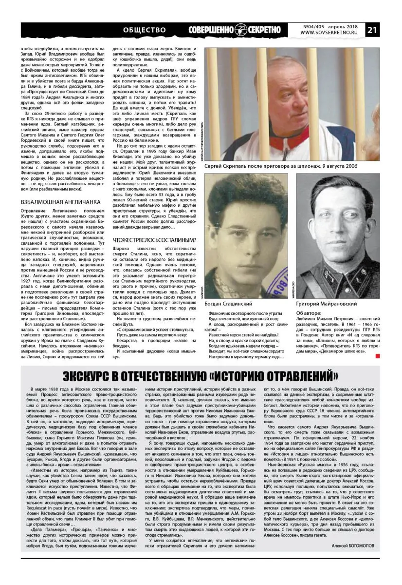 Советская история ядов достаточно живописна, ядами начали глубоко интересоваться после выстрелов Фанни Каплан в Ленина отравленными пулями. Позже при ОГПУ была создана специальная лаборатория. Впрочем, Иосиф Виссарионович предпочитал расправляться с политическими противниками старомодными способами, с ядами осторожничал. Видному чекисту, изменнику Агабекову наш боевик-турок воткнул ятаган в бок, нелегалу Порецкому-Рейссу запросто проломили голову и бросили в озеро, главе украинских националистов полковнику Евгению Коновальцу будущий генерал Павел Судоплатов в 1938 году благодарно поднёс в кафе в Роттердаме изящную коробку конфет с неизящной взрывчаткой (из мирных голландцев, к счастью, серьёзно никто не пострадал), Троцкого укокошили альпенштоком. Возможно, были отравлены Максим Горький, председатель Высшего совета народного хозяйства Валериан Куйбышев, председатель ОГПУ Менжинский. Но доказательства этому отсутствуют – скорее домыслы и лжесвидетельства на процессах, когда во всём обвинялись злодеи-врачи.