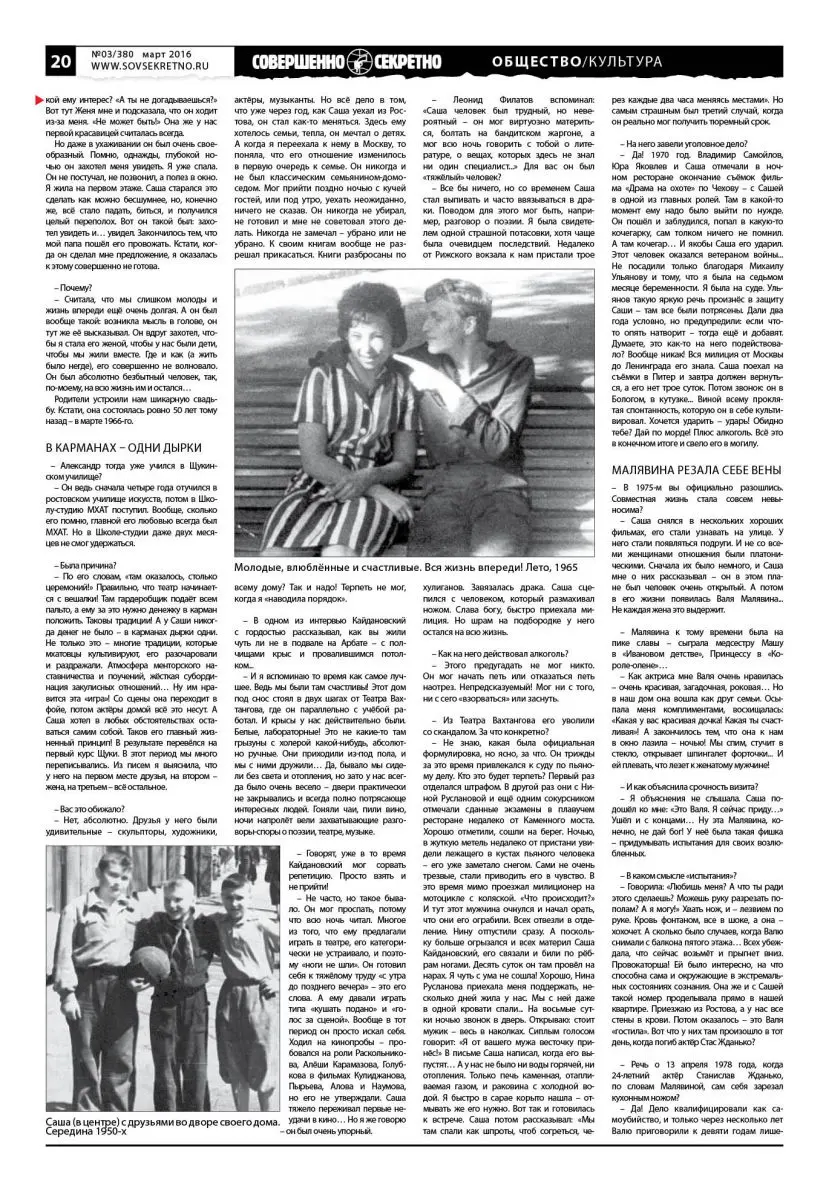 – Да! 1970 год. Владимир Самойлов, Юра Яковлев и Саша отмечали в ночном ресторане окончание съёмок фильма «Драма на охоте» по Чехову – с Сашей в одной из главных ролей. Там в какой-то момент ему надо было выйти по нужде. Он пошёл и заблудился, попал в какую-то кочегарку, сам толком ничего не помнил. А там кочегар… И якобы Саша его ударил. Этот человек оказался ветераном войны… Не посадили только благодаря Михаилу Ульянову и тому, что я была на седьмом месяце беременности. Я была на суде. Ульянов такую яркую речь произнёс в защиту Саши – там все были потрясены. Дали два года условно, но предупредили: если что-то опять натворит – тогда ещё и добавят. Думаете, это как-то на него подействовало? Вообще никак! Вся милиция от Москвы до Ленинграда его знала. Саша поехал на съёмки в Питер и завтра должен вернуться, а его нет трое суток. Потом звонок: он в Бологом, в кутузке… Виной всему проклятая спонтанность, которую он в себе культивировал. Хочется ударить – ударь! Обидно тебе? Дай по морде! Плюс алкоголь. Всё это в конечном итоге и свело его в могилу.