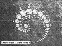 Можно еще долго гадать, каким образом появляются сложные пиктограммы, но, похоже, все точки над i расставила сенсационная видеосъемка, которая была сделана 11 августа 1996 года в местечке Оливер-Кастл (Англия). Ее представил в ноябре того же года в Финляндии участникам Первой конференции по исследованию внеземного разума и будущего человечества уже известный нам Колин Эндрюс. Видеокамера бесстрастно зафиксировала пролет над полем трех пар светящихся шаров. Сначала два шара, двигаясь по сложной траектории, казалось, наметили контуры будущего «полотна». Затем их маневр повторила вторая пара шаров, и буквально на глазах (за 1,5–2 секунды) растения улеглись, создав идеальную пиктограмму. И тут же, как бы проверяя качество работы, над рисунком пролетела третья пара «шаровых молний».
