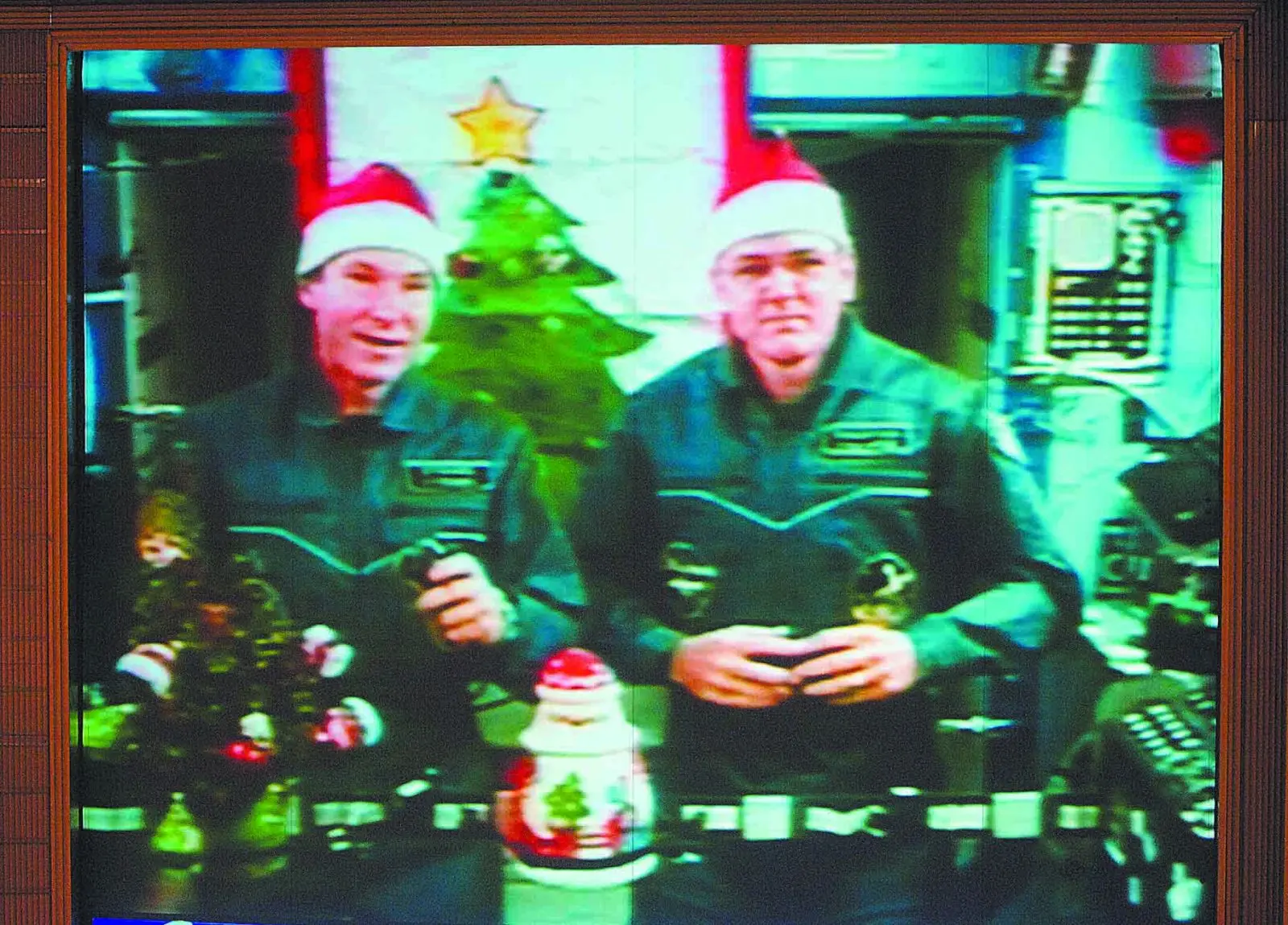 члены международного экипажа 12-й экспедиции на мкс валерий токарев и уильям макартур во время сеанса связи с дедом морозом в центре управления полетами в подмосковном королёве / александр саверкин/ТАСС