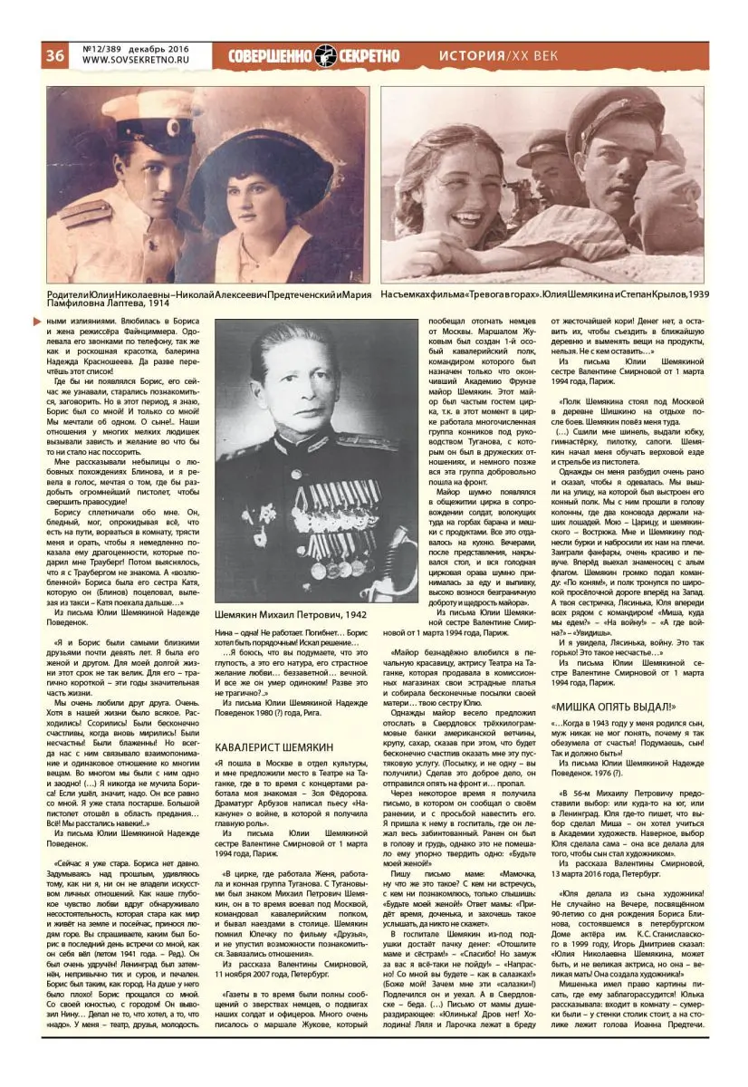 «В цирке, где работала Женя, работала и конная группа Туганова. С Тугановыми был знаком Михаил Петрович Шемякин, он в то время воевал под Москвой, командовал кавалерийским полком, и бывал наездами в столице. Шемякин помнил Юлечку по фильму «Друзья», и не упустил возможности познакомиться. Завязались отношения».