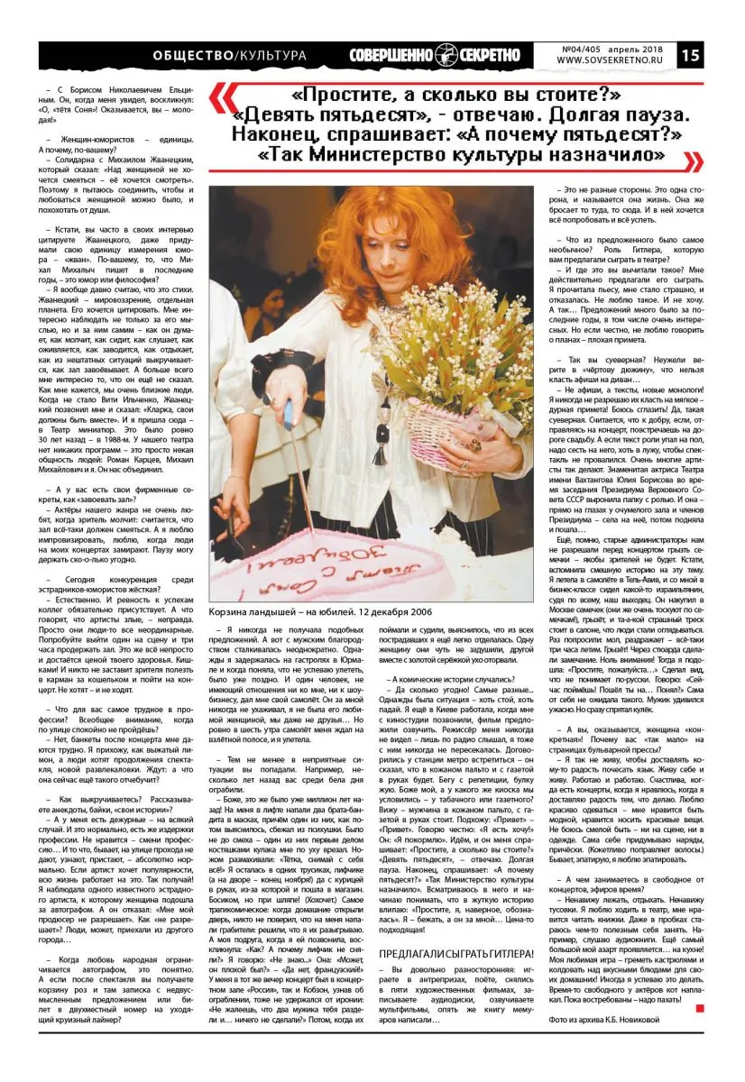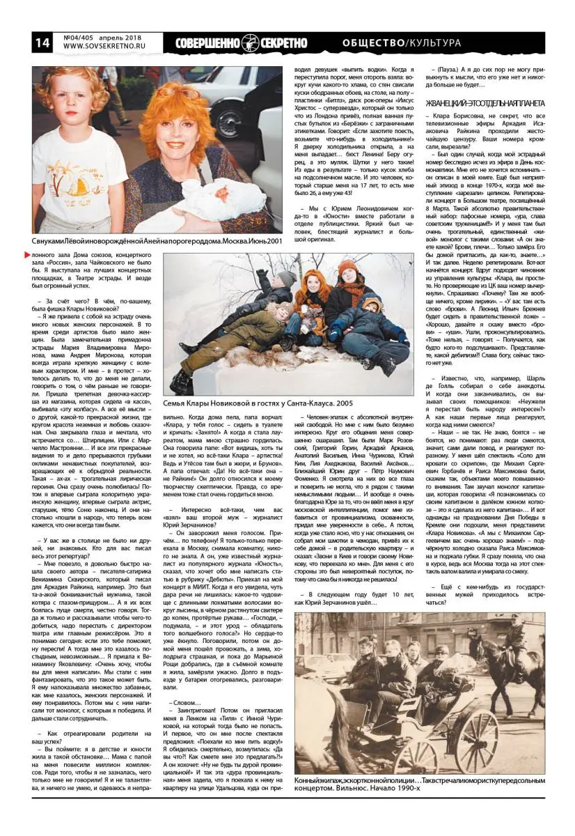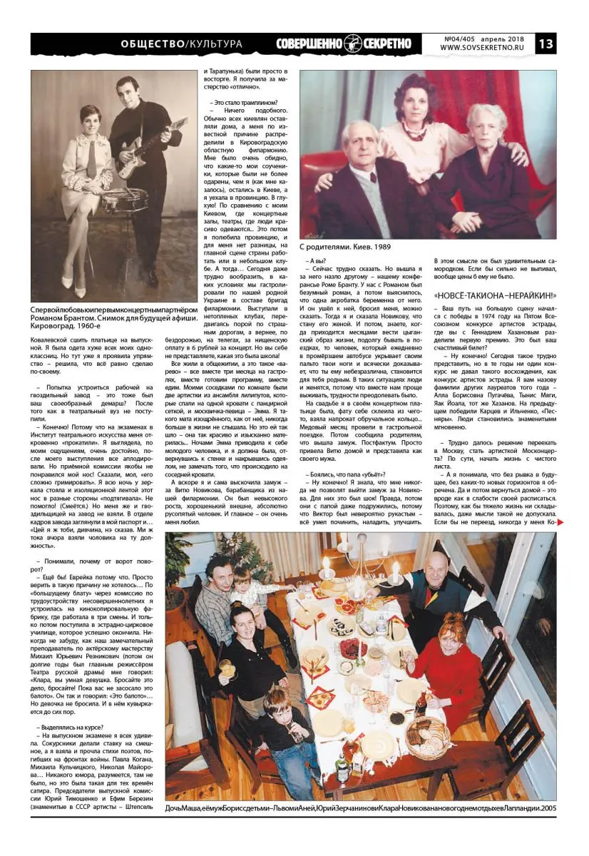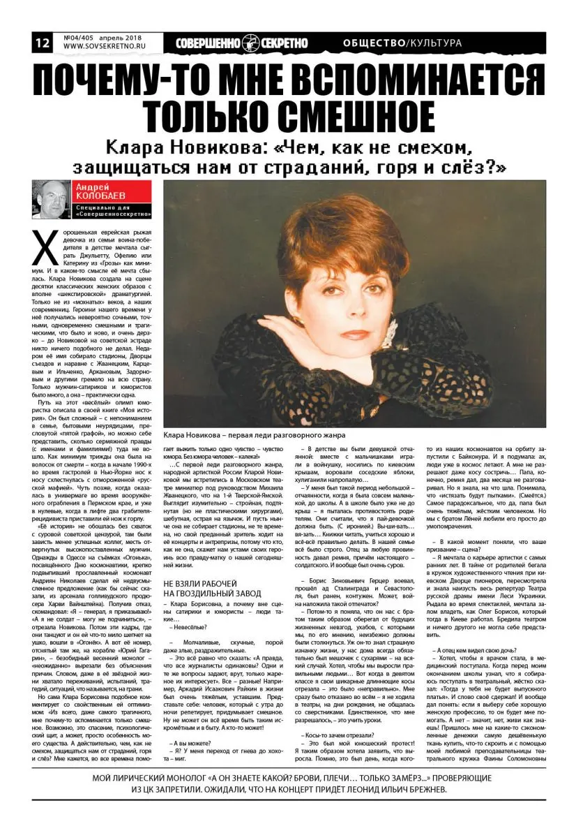 …С первой леди разговорного жанра, народной артисткой России Кларой Новиковой мы встретились в Московском театре миниатюр под руководством Михаила Жванецкого, что на 1-й Тверской-Ямской. Выглядит изумительно – стройная, подтянутая (но не пластическими хирургами), шебутная, острая на язычок. И пусть нынче она не собирает стадионы, не те времена, но свой преданный зритель ходит на её концерты и антрепризы, потому что кто, как не она, скажет нам устами своих героинь всю правду-матку о нашей сегодняшней жизни.