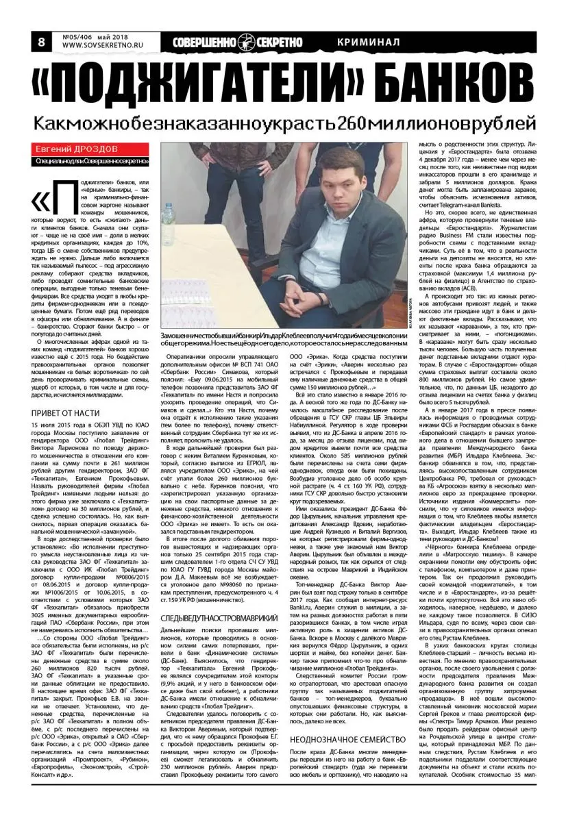 А в январе 2017 года в прессе появилась информация о проводимых сотрудниками ФСБ и Росгвардии обысках в банке «Европейский стандарт» в рамках уголовного дела в отношении бывшего зампреда правления Международного банка развития (МБР) Ильдара Клеблеева. Экс-банкир обвинялся в том, что, представляясь высокопоставленным сотрудником Центробанка РФ, требовал от руководства КБ «Агросоюз» взятку в несколько миллионов евро за прекращение проверки. Источники издания «Коммерсантъ» пояснили, что «у силовиков имеется информация о том, что Клеблеев якобы является фактическим владельцем «Евростандарта». Выходит, Ильдар Клеблеев также из тени руководил и ДС-Банком?