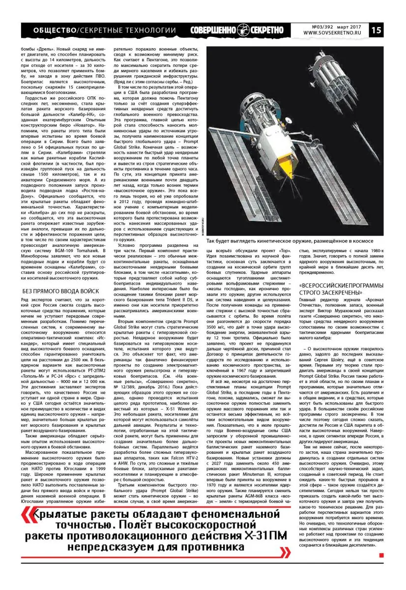 Гордостью же российского ОПК последних лет, несомненно, стала крылатая ракета морского базирования большой дальности «Калибр-НК», созданная екатеринбургским Опытным конструкторским бюро «Новатор». Напомним, что ракеты этого типа были впервые испытаны во время боевой операции в Сирии. Всего было заявлено о 54 официальных пусках по целям в Сирии. «Калибрами» стреляли как малые ракетные корабли Каспийской флотилии (в частности, был произведён групповой пуск на дальность свыше 1500 километров), так и из акватории Средиземного моря. А из подводного положения запуск производила подводная лодка «Ростов-на-Дону». Официально сообщается, что эти крылатые ракеты обладают феноменальной точностью. Характеристики «Калибра» до сих пор не раскрыты, но сообщается, что эта высокоточная ракета опережает известные зарубежные аналоги, превышая их по дальности и эффективности поражения цели, в том числе по своим характеристикам превосходит аналогичную американскую систему BGM-109 Tomahawk. В Минобороны заявляют, что все новые подводные лодки и корабли будут со временем оснащены «Калибрами», составив основу российской группировки носителей высокоточного оружия.