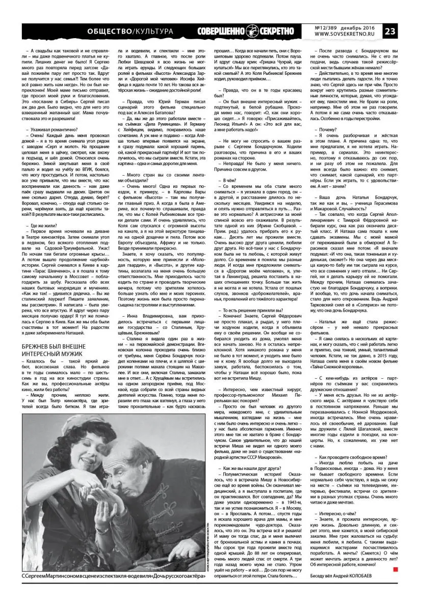 – Так совпало, что когда Сергей Аполлинариевич с Тамарой Фёдоровной набирали курс, она как раз окончила десятый класс. И Наташа сама пошла к ним сдавать экзамены. Мы с моей мамой от переживаний были в обмороке! А Герасимов сказал мне потом: «Я вначале подумал: «И что она, такая тоненькая и худенькая, сможет?» Но она через два месяца какую-то бабу им так сыграла на курсе, что все сомнения у него отпали… Ни Сергей, ни я делать карьеру ей не помогали. Между прочим, Наташа снималась зачастую не благодаря Бондарчуку, а вопреки. И вообще, то, что дочь начала сниматься, стало для него откровением. Ведь Андрей Тарковский снял её в «Солярисе» не потому, что она дочь Бондарчука.