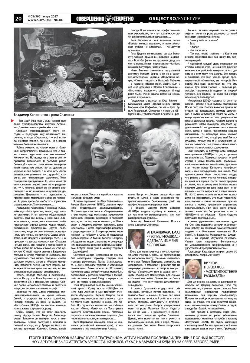 Так получилось, что в 1990-х я познакомился с Николаем Годовиковым – Петрухой из «Белого солнца пустыни». Для меня было открытием, что начинал он свою актёрскую карьеру в «Республике ШКИД». Николай познакомил меня с другими шкидовцами (шкидцами, как они сами себя называют): Александром Кавалеровым (10.07.1951–17.06.2014), Виктором Переваловым, Владимиром Колесниковым, Александром-Сандро (30.04.1944–19.12.2002), позже – с Виолеттой Жухимович и Вячеславом Голубковым. И хотя нам всем было уже далеко и за тридцать, и за сорок, мы были друг для друга: Коля, Володя, Саша, Сандро… Тогда-то я и начал записывать рассказы о том, как снимался один из лучших фильмов моего детства. Позже журналистская профессия свела меня и с режиссёром Геннадием Ивановичем Полокой (15.07.1930–05.12.2014).