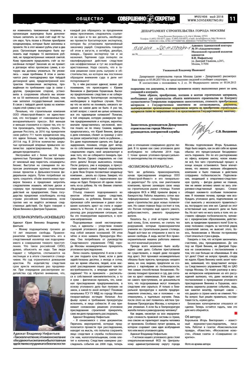 Кто знаком с работой правоохранительных органов, тот знает: без заявления потерпевшего уголовное дело возбудить практически невозможно. А тут – пожалуйста! Можно предположить, что в столичном правительстве просто не заметили кражи, зато бдительные оперативники ФСБ вовремя оказались на месте и не дали в обиду доверчивого заказчика. Но вот незадача. Оказывается, Правительство Москвы потерпевшим себя никогда не считало! Оно официально заявило: к ООО «Новострой-Инвест» претензий не имеет – заплатило за работу ровно столько, сколько записано в договоре и ни копейкой больше. Вот письмо Департамента строительства города Москвы, адресованное адвокату учредителя фирмы Владимиру Нифантьеву: «…приобретение, поставка и монтаж строительных материалов, необходимых для строительства объекта капитального строительства, по контракту осуществляется генеральным подрядчиком самостоятельно, стоимость приобретённых материалов с государственным заказчиком не согласовывается, документы, подтверждающие произведённые подрядчиком затраты на приобретение строительных материалов, также не запрашиваются и не предоставляются государственному заказчику».