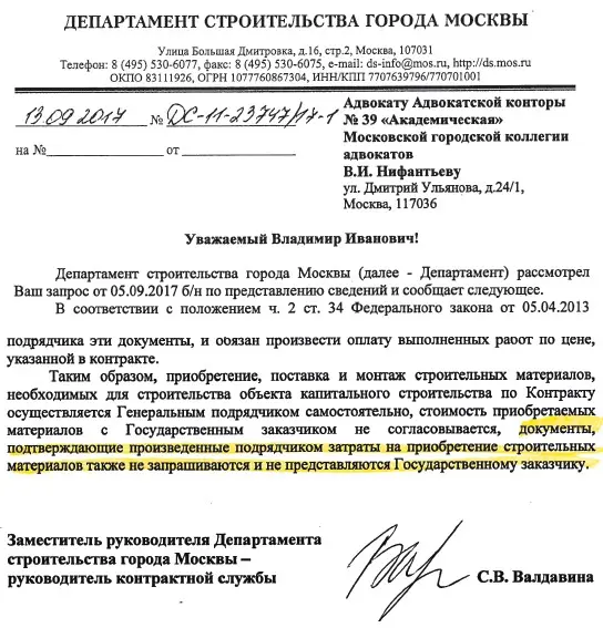В ответе адвокату Департамент строительства города Москвы сослался на письма Министерства экономического развития России, в которых чёрным по белому записано: заказчик не вправе включать в контракт условие о предоставлении поставщиком (подрядчиком, исполнителем) финансового отчёта о понесённых расходах и подтверждающих эти затраты копий первичных бухгалтерских документов.