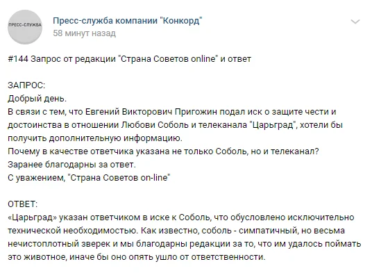 Пресс-служба компании «Конкорд» петербургского предпринимателя Евгения Пригожина прокомментировала подачу иска о защите чести и достоинства к юристу ФБК (НКО -иноагент) Любови Соболь и к телеканалу «Царьград».