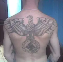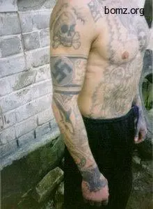 Заметна ныне в наколочной тематике и фашистская тема (свастики всех видов, злобные орлы неведомых пород с той же самой свастикой в когтях, погоны, копирующие эсэсовские, и т.д.). Довелось встречать несколько наколотых портретов Гитлера. Однажды увидел на груди одного из мывшихся в бане арестантов внушительных размеров портрет этого самого Адольфа. Запечатлённый фюрер смахивал на что-то среднее между сгинувшим в эпоху культа личности маршалом Блюхером и бравым солдатом Швейком. Если бы не окантовка из свастик всех калибров, основателя Третьего рейха не узнать. Лет двадцать тому назад подобный сюжет, навечно запечатлённый на человеческом теле, даже представить было бы трудно. Иные времена – иные нравы. И тематика живописи по телу совсем иная.