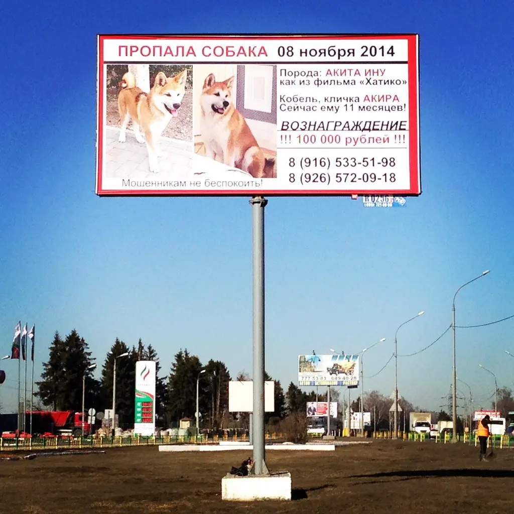 На пересечении двух больших шоссейных подмосковных дорог висит биллборд: «Пропала собака. Кобель, белый с рыжим, хвост завернут калачиком, ушки стоят, глаза карие. Сейчас может быть где угодно. Возможно, такая собака появилась у ваших соседей? Вознаграждение гарантировано». Сумма по сегодняшним временам огромная – 100 000 руб. Хозяйка собаки рассказала нам о печальных обстоятельствах случившегося: «8 апреля будет 5 месяцев, как Акира (или, как ласково звали его в нашей семье, Акуша) пропал, вернее, был украден, а 14 апреля ему исполнится 1 годик. Его подарил мне муж на день рождения, у меня никогда не было собаки и про акита-ину, японскую породу (как из фильма «Хатико»), я даже не знала и в такого скромного красавца с раскосыми глазами влюбилась сразу!