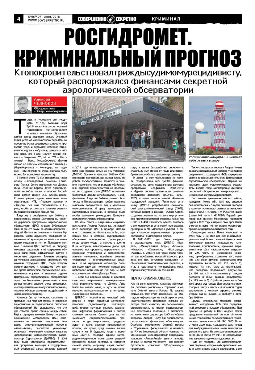 Так что неспроста персона Андрея Нечты вызвала неподдельный интерес у молодого оперативного сотрудника ФСБ, курировавшего в то время деятельность Центральной аэрологической обсерватории. Первые же проверки дали ошеломительные результаты. Судите сами: миллиардные финансы секретной обсерватории контролировал… неоднократно судимый рецидивист.
