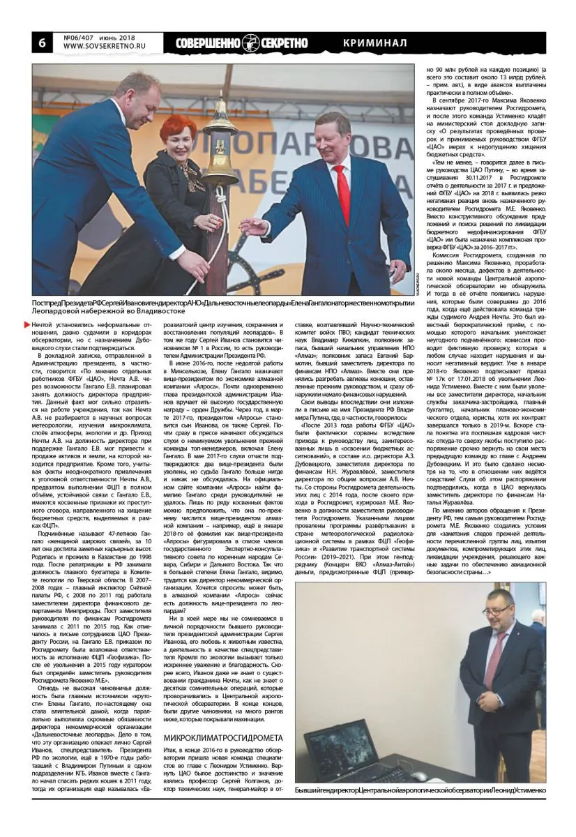 В июне 2016-го, после недолгой работы в Минсельхозе, Елену Гангало назначают вице-президентом по экономике алмазной компании «Алроса». Почти одновременно глава президентской администрации Иванов вручает ей высокую государственную награду – орден Дружбы. Через год, в марте 2017-го, президентом «Алросы» становится сын Иванова, он также Сергей. Почти сразу в прессе начинают обсуждаться слухи о неминуемом увольнении прежней команды топ-менеджеров, включая Елену Гангало. В мае 2017-го слухи отчасти подтверждаются: два вице-президента были уволены, но судьба Гангало больше нигде и никак не обсуждалась. На официальном сайте компании «Алроса» найти фамилию Гангало среди руководителей не удалось. Лишь по ряду косвенных фактов можно предположить, что она по-прежнему числится вице-президентом алмазной компании – например, ещё в январе 2018-го её фамилия как вице-президента «Алросы» фигурировала в списке членов государственного Экспертно-консультативного совета по коренным народам Севера, Сибири и Дальнего Востока. Так что в большей степени Елена Гангало, видимо, трудится как директор некоммерческой организации. Хочется спросить: может быть, в алмазной компании «Алроса» сейчас есть должность вице-президента по леопардам?