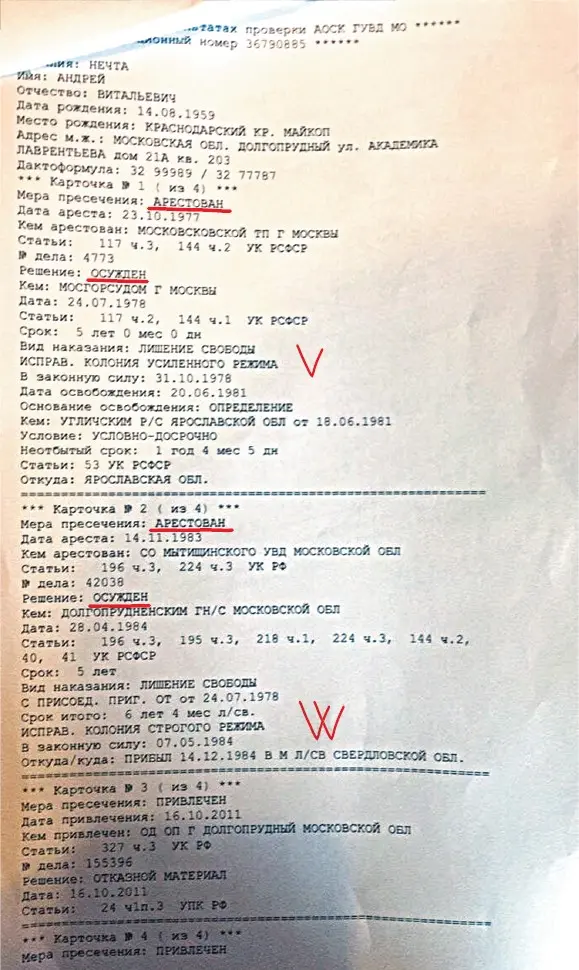 Карта криминального учёта бывшего заместителя директора секретной обсерватории Андрея Нечты