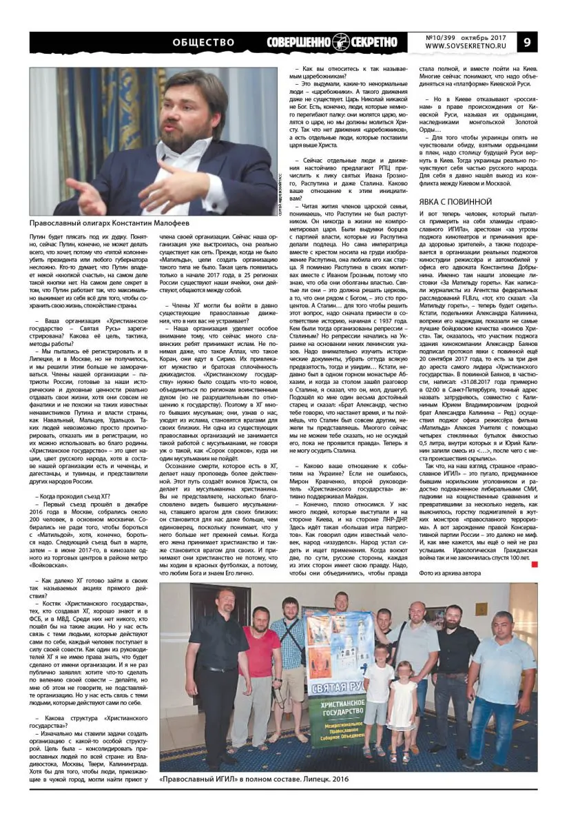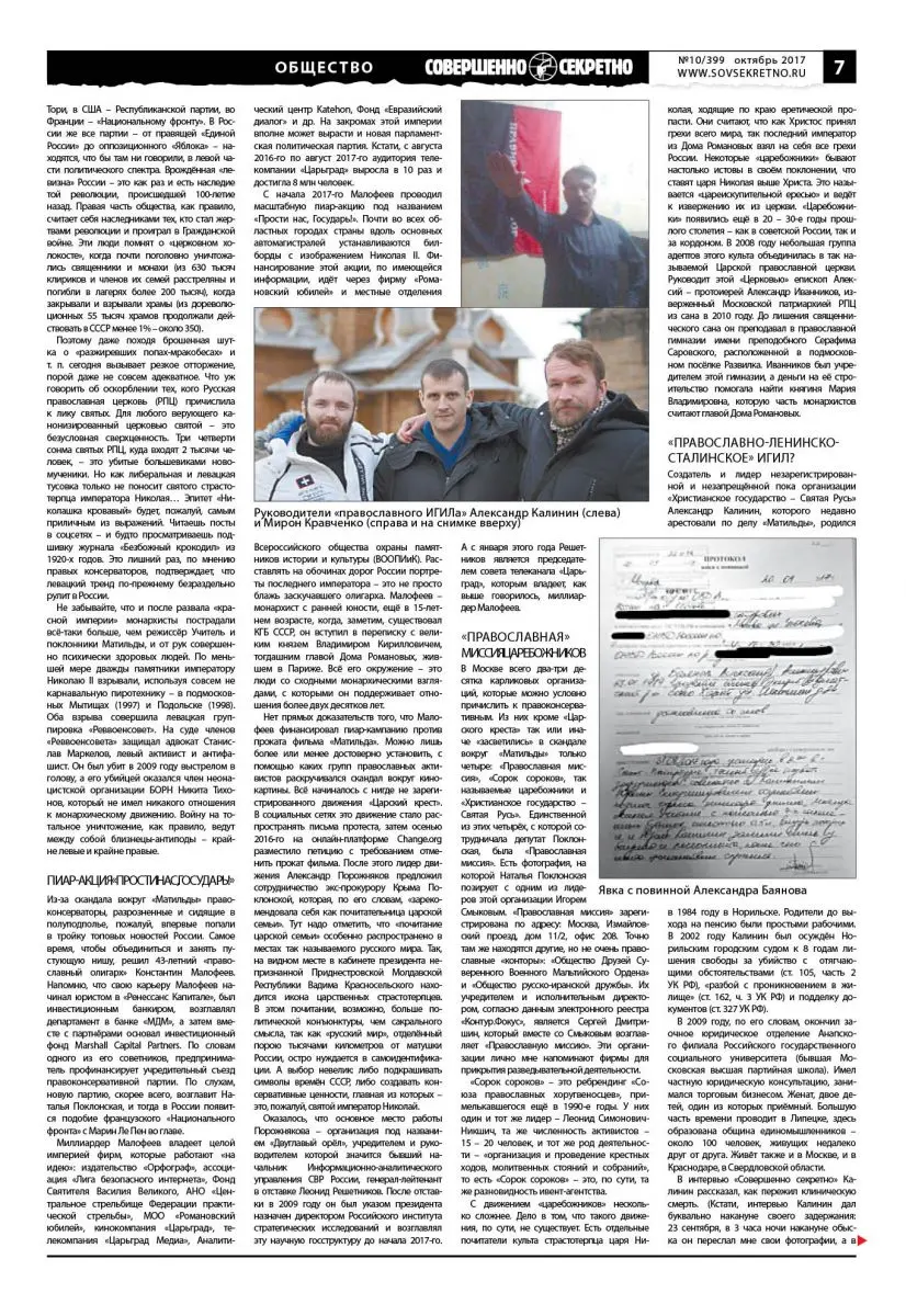 С начала 2017-го Малофеев проводил масштабную пиар-акцию под названием «Прости нас, Государь!». Почти во всех областных городах страны вдоль основных автомагистралей устанавливаются билборды с изображением Николая II. Финансирование этой акции, по имеющейся информации, идёт через фирму «Романовский юбилей» и местные отделения Всероссийского общества охраны памятников истории и культуры (ВООПИиК). Расставлять на обочинах дорог России портреты последнего императора – это не просто блажь заскучавшего олигарха. Малофеев – монархист с ранней юности, ещё в 15-летнем возрасте, когда, заметим, существовал КГБ СССР, он вступил в переписку с великим князем Владимиром Кирилловичем, тогдашним главой Дома Романовых, жившем в Париже. Всё его окружение – это люди со сходными монархическими взглядами, с которыми он поддерживает отношения более двух десятков лет.