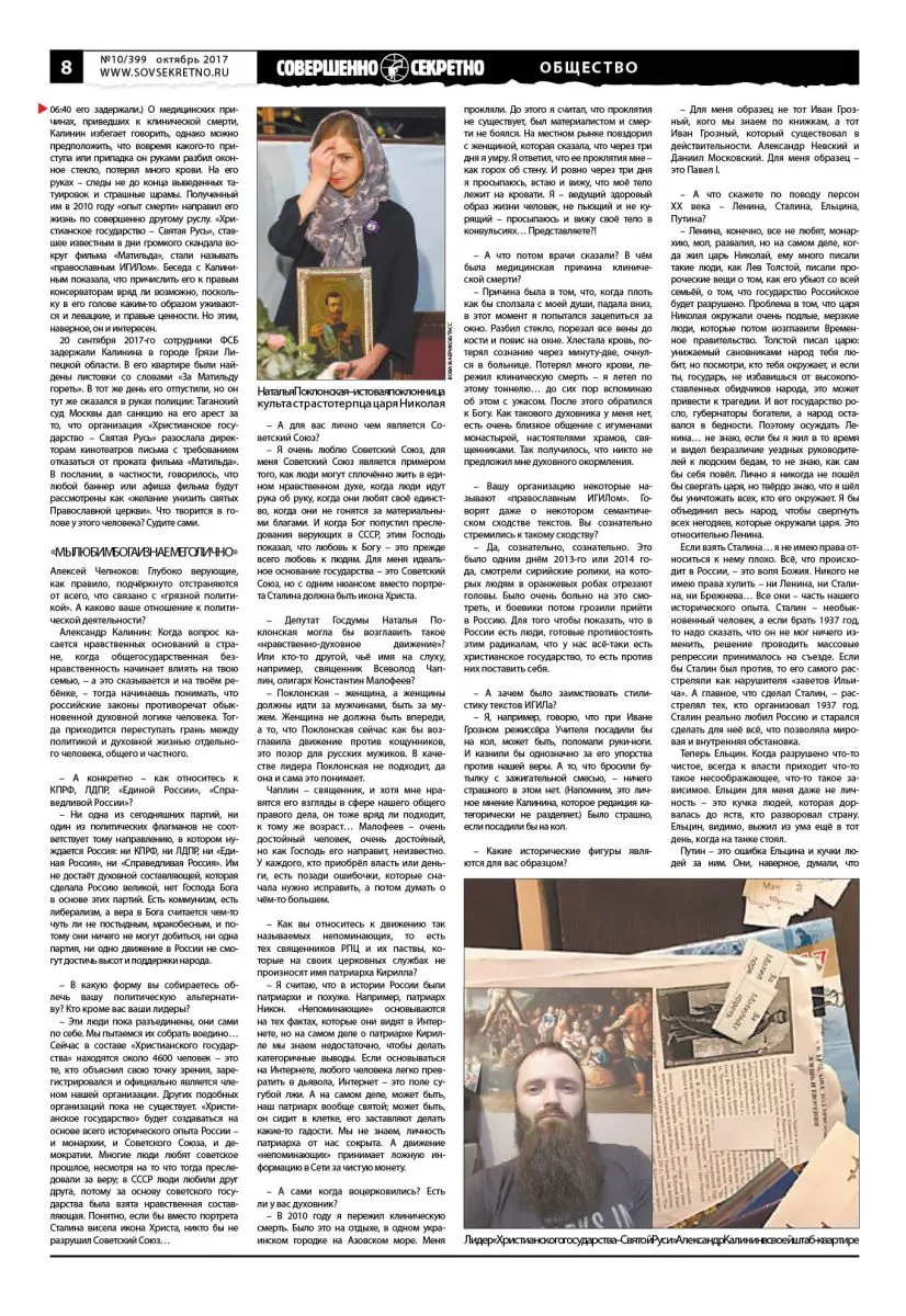 23 сентября, в 3 часа ночи накануне обыска он переслал мне свои фотографии, а в 06:40 его задержали.) О медицинских причинах, приведших к клинической смерти, Калинин избегает говорить, однако можно предположить, что вовремя какого-то приступа или припадка он руками разбил оконное стекло, потерял много крови. На его руках – следы не до конца выведенных татуировок и страшные шрамы. Полученный им в 2010 году «опыт смерти» направил его жизнь по совершенно другому руслу. «Христианское государство – Святая Русь», ставшее известным в дни громкого скандала вокруг фильма «Матильда», стали называть «православным ИГИЛом». Беседа с Калининым показала, что причислить его к правым консерваторам вряд ли возможно, поскольку в его голове каким-то образом уживаются и левацкие, и правые ценности. Но этим, наверное, он и интересен.