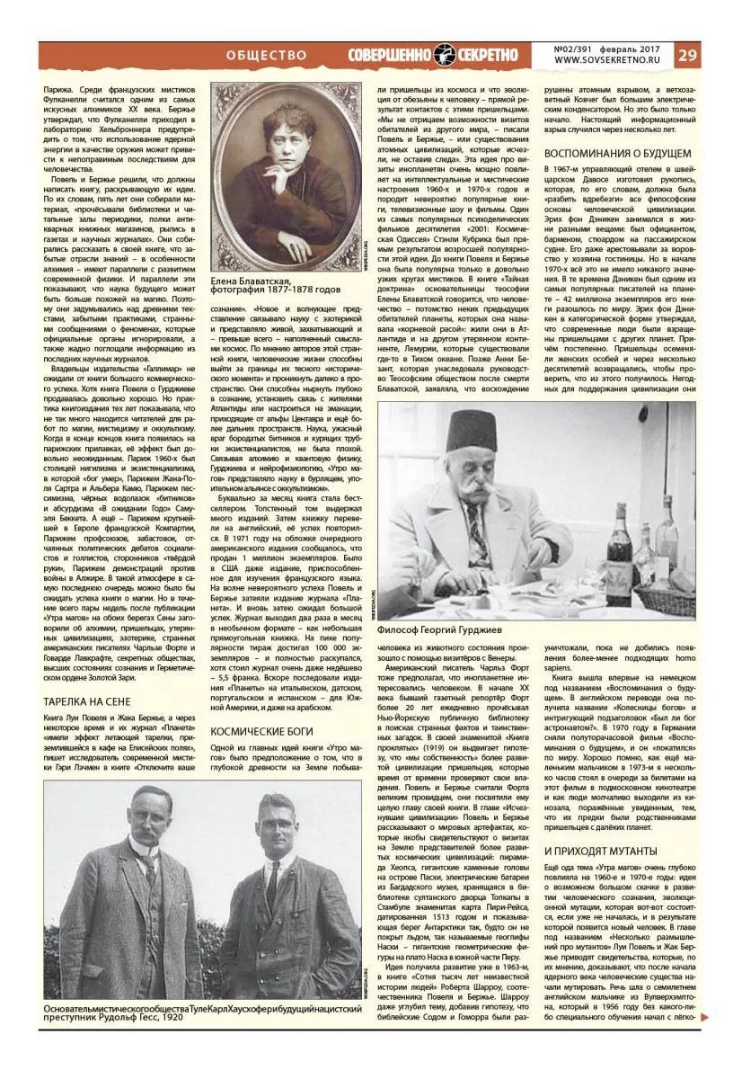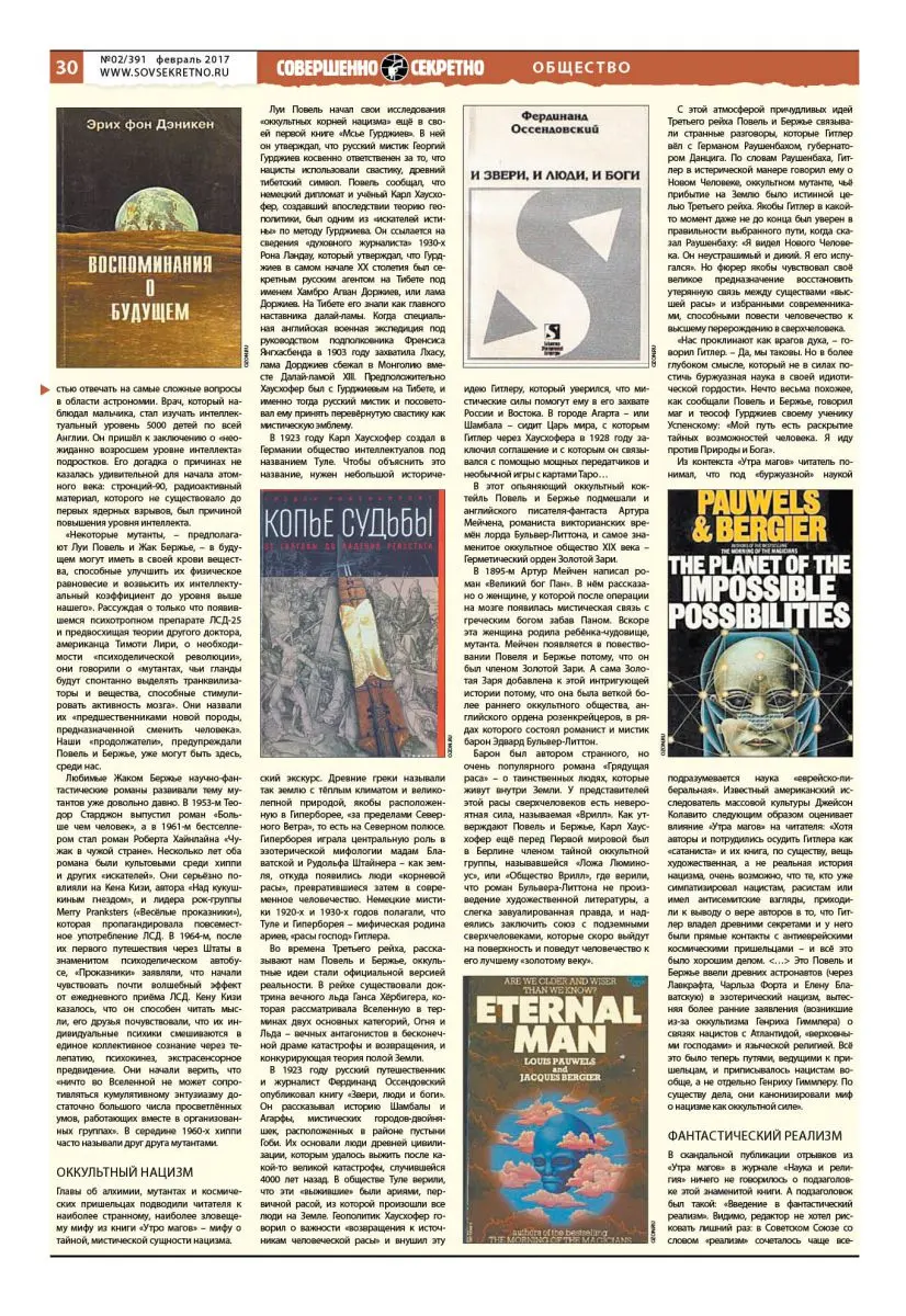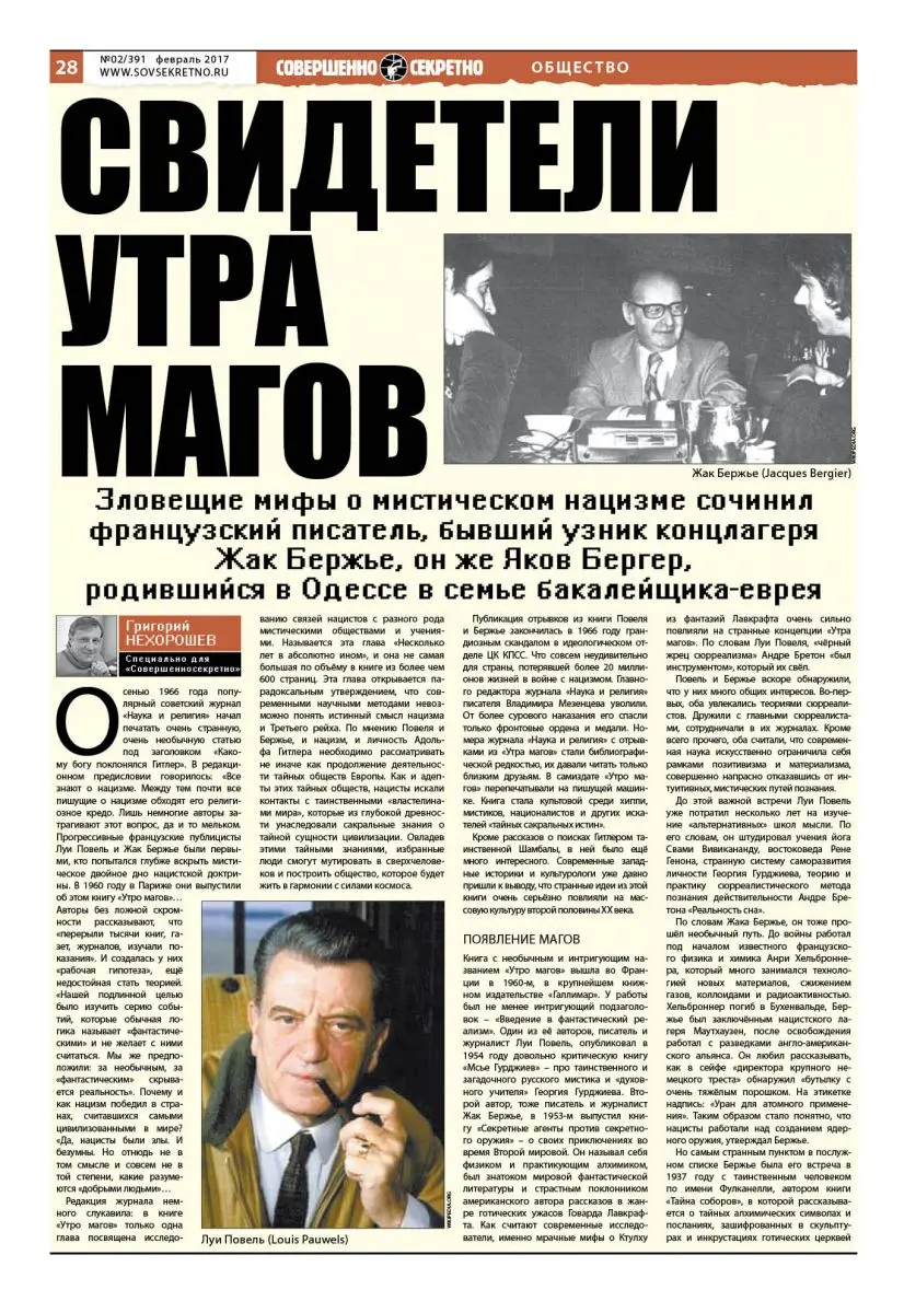 Осенью 1966 года популярный советский журнал «Наука и религия» начал печатать очень странную, очень необычную статью под заголовком «Какому богу поклонялся Гитлер». В редакционном предисловии говорилось: «Все знают о нацизме. Между тем почти все пишущие о нацизме обходят его религиозное кредо. Лишь немногие авторы затрагивают этот вопрос, да и то мельком. Прогрессивные французские публицисты Луи Повель и Жак Бержье были первыми, кто попытался глубже вскрыть мистическое двойное дно нацистской доктрины. В 1960 году в Париже они выпустили об этом книгу «Утро магов»… Авторы без ложной скромности рассказывают, что «перерыли тысячи книг, газет, журналов, изучали показания». И создалась у них «рабочая гипотеза», ещё недостойная стать теорией. «Нашей подлинной целью было изучить серию событий, которые обычная логика называет «фантастическими» и не желает с ними считаться. Мы же предположили: за необычным, за «фантастическим» скрывается реальность». Почему и как нацизм победил в странах, считавшихся самыми цивилизованными в мире? «Да, нацисты были злы. И безумны. Но отнюдь не в том смысле и совсем не в той степени, какие разумеются «добрыми людьми»…