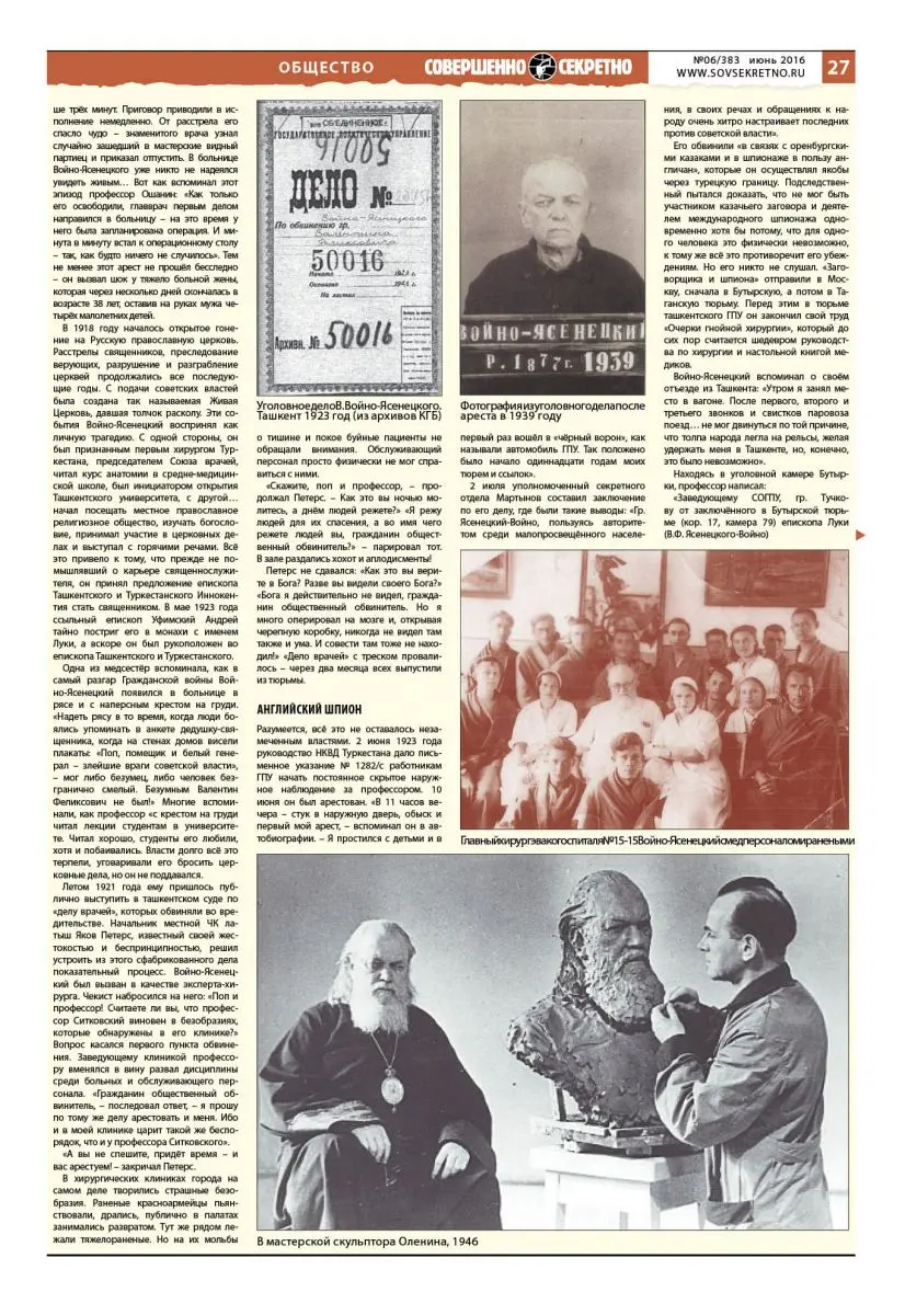 Ответ: С ним я познакомился скоро после моего приезда в Ташкент… Из ряда бесед мне стало ясно, что он непримиримый враг советской власти. Я рассказал ему, что по поручению Потатуева, действующего от имени английской разведки, я создал контрреволюционную церковно-монашескую организацию, изложил ему задачи этой организации и планы по созданию сети таких групп при церковных общинах. Этой беседой я преследовал цель вербовки Войно-Ясенецкого, причём был уверен, что если он не согласится вступить в нашу организацию, то, во всяком случае, не выдаст нас… В дальнейшем мне стало известно, что он является членом Всесоюзного контрреволюционного церковного центра, и он фактически давал целый ряд установок по контрреволюционной работе…