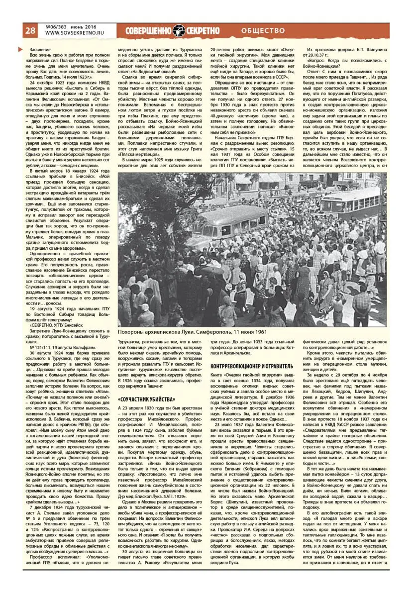 Ответ: С ним я познакомился скоро после моего приезда в Ташкент… Из ряда бесед мне стало ясно, что он непримиримый враг советской власти. Я рассказал ему, что по поручению Потатуева, действующего от имени английской разведки, я создал контрреволюционную церковно-монашескую организацию, изложил ему задачи этой организации и планы по созданию сети таких групп при церковных общинах. Этой беседой я преследовал цель вербовки Войно-Ясенецкого, причём был уверен, что если он не согласится вступить в нашу организацию, то, во всяком случае, не выдаст нас… В дальнейшем мне стало известно, что он является членом Всесоюзного контрреволюционного церковного центра, и он фактически давал целый ряд установок по контрреволюционной работе…